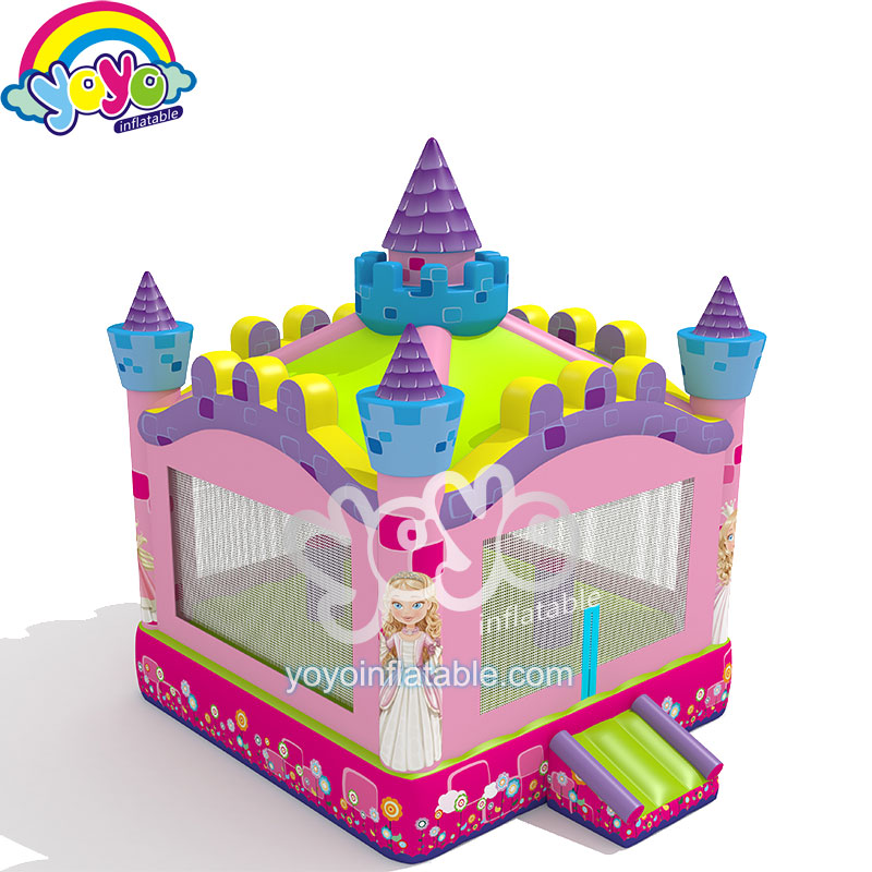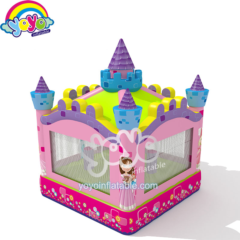 The incredible princess castle inflatable bouncer is an original design from yoyo factory. It’s super cool and beautiful, made of colorful pvc fabric and intricate crown molding. Four different princesses printing on the four inflatable structural columns. The red bottom also has beautiful flowers digital printing too. Four side walls are white mesh, convenient for watching. Three fun obstacle pillars inside the bouncing area, basketball hoop is available for customization. This 14×14 feet pink princess bouncing castle is a perfect gift for little girl’s birthday party. Buy your unique entertainment inflatables from yoyo.