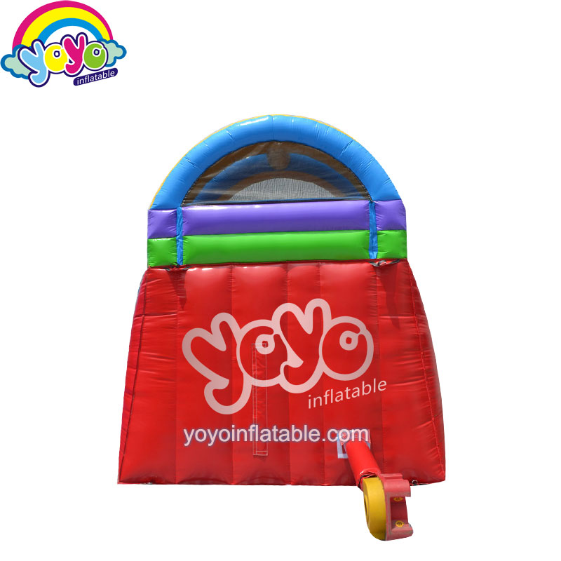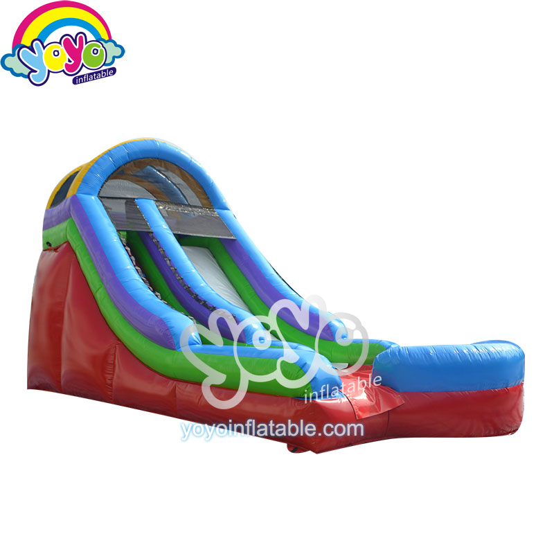 This 15 feet height rainbow inflatable water slide is a simple design, made of 15oz pvc fabric, with blue, red, green yellow and white colors, no cartoon and digital printing for decorations to lower the costs. A climbing stair with drawstring handrail on the left, a wider slide lane on the right, with a small splash pool at the bottom, best summer entertainment game for children. This inflatable water slide is a regular bounce house size, perfect for summer holiday’s birthday party if you are tired of jump house. If you are looking for one most cost-effective wet inflatable unit for your new party rental business this summer, this design will be a good choice. Come to yoyo and buy it!