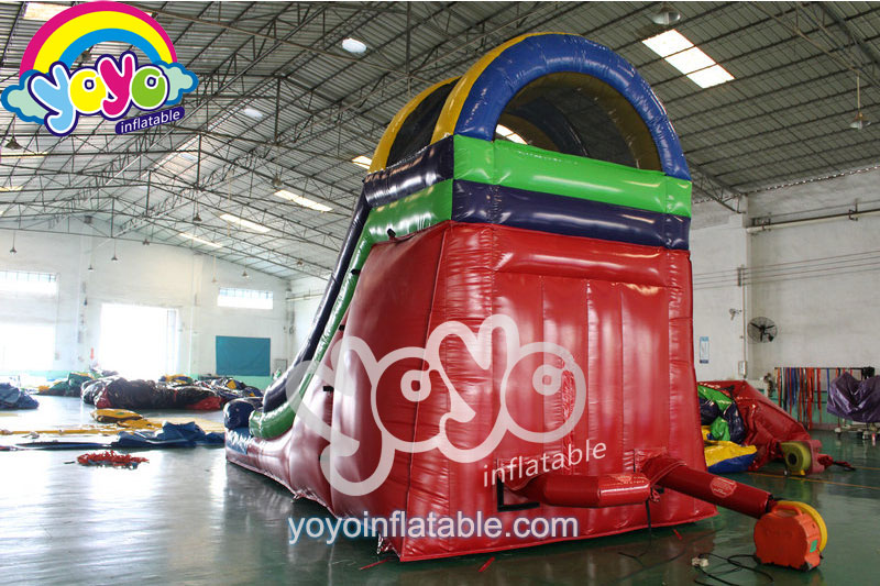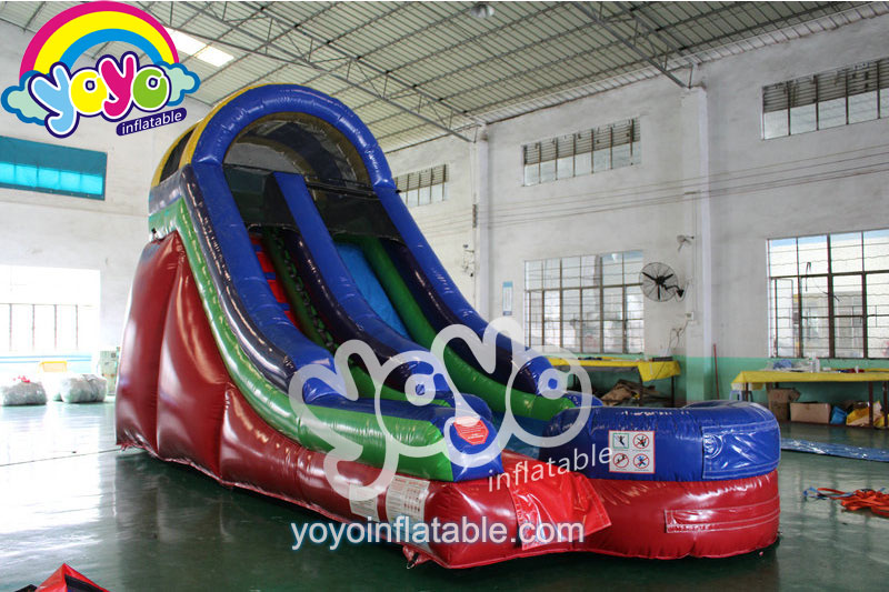 This 15 feet tall inflatable water slide is a very cost-effective design. Without any extra decorative cartoons and digital printing, this unit is made of red, green and blue three bright colors of fabric material. Attractive and cost-effective. One climbing stair and one wider sliding lane design, with a small splash pool at the bottom. Strong safety netting on the top and small replaceable business banner at the bottom. It’s one of the most playful water games for kids during hot summer holidays. The fabric material is commercial grade 15oz pvc, super strong and durable. This unit is not only suitable for the party rental business, but also affordable for family entertainment.