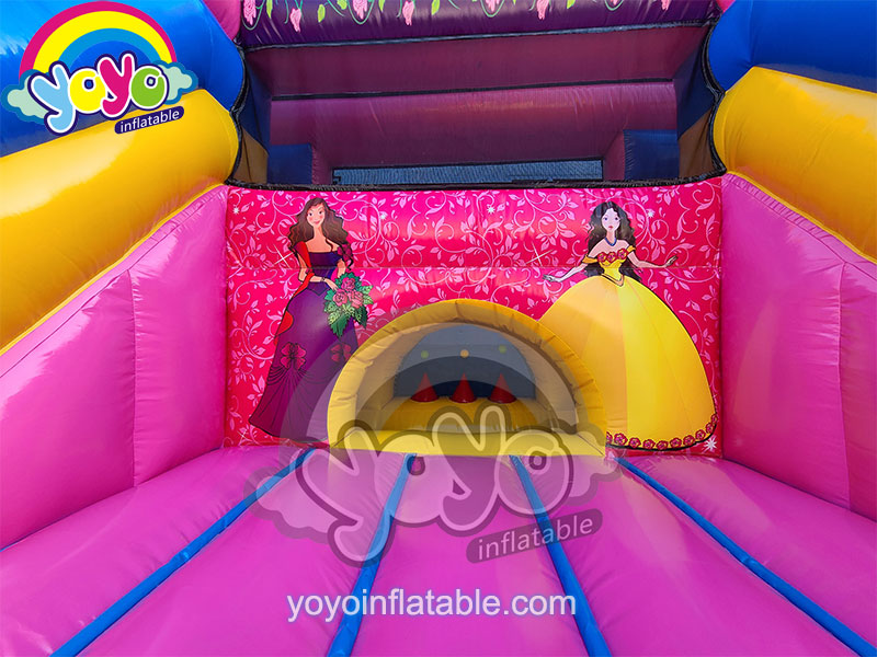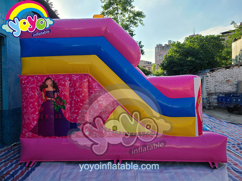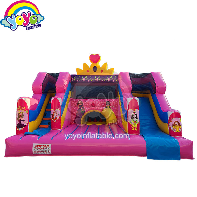 If you are looking for some inflatable bouncers with cute princess themes, this one will absoutly surprising you. It’s open structure design, the center is a large bouncing area with an inflatable back wall, climbing ladder on the left and fun slide on the right to suround the bouncing park. A special Royal inflatable arch in the center for kids to climb and have fun. An eye-catching inflatable princess crown on the top of the structure, very conspicuous and attractive. The basic color is pink, which is the favorite color for little girls. The product has a sponge cushion, which can be replace.