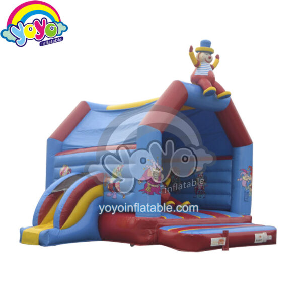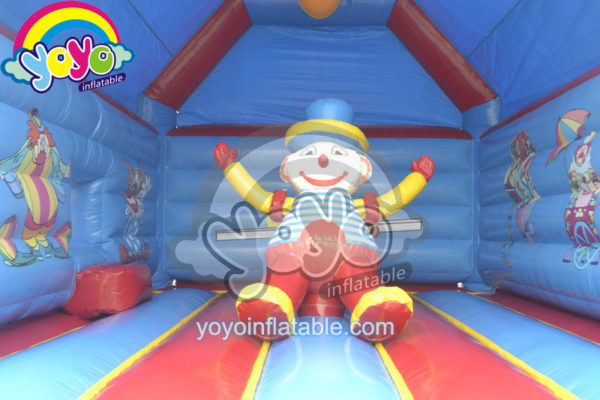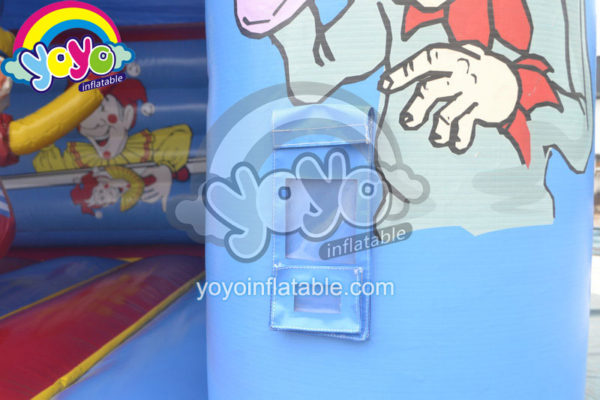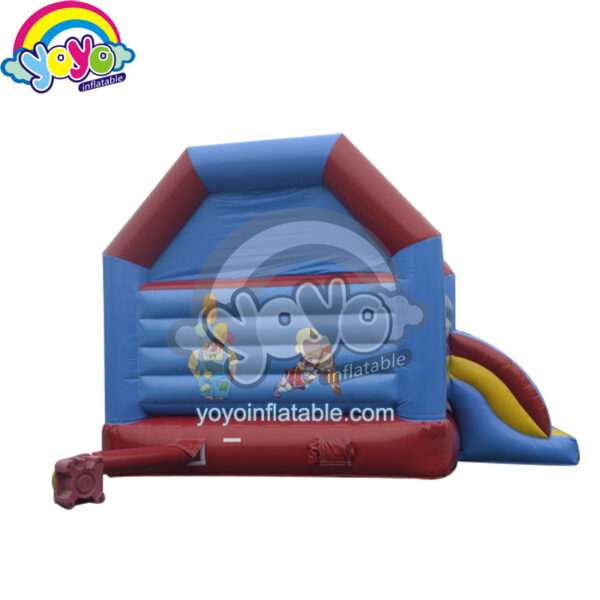 The excellent bounce house combo is designed with another also very popular theme – The Circus Clown. 19 feet width inflatable bouncer with an open front, everything is clear at a glance. A large cartoon clown in the center, and a 13 feet slide on the left. Kids can jump around and sliding out of the bounce house. Shaded roof design so that it can be placed in the outdoors, convenient for the backyard birthday parties and other kinds of activities. This one has a size of 19.8’x18’x13′, if it’s a little bigger than you expect, we can make it smaller with the same designs.