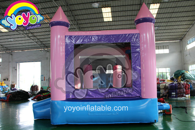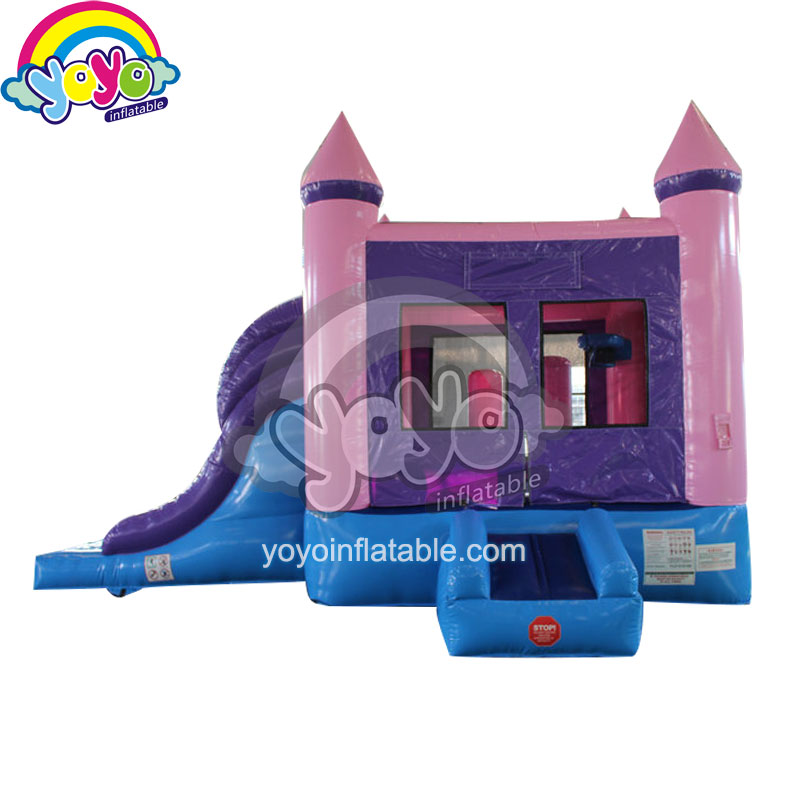 This rainbow theme inflatable bouncy castle combo is designed with basically purple and blue colors, feature with double-lane dry slide on the left. The front designed with blank business banner Velcro structure for commercial use. Mesh walls for parents to watch their kids from outside. Basketball hoop and obstacle pillars inside design for the kids to have more fun in addition to jumping and sliding. Super fun castle for children in summer holidays. Our base is 64CM high, and our products also comply with the American ASTM safety standards