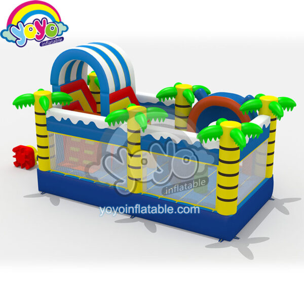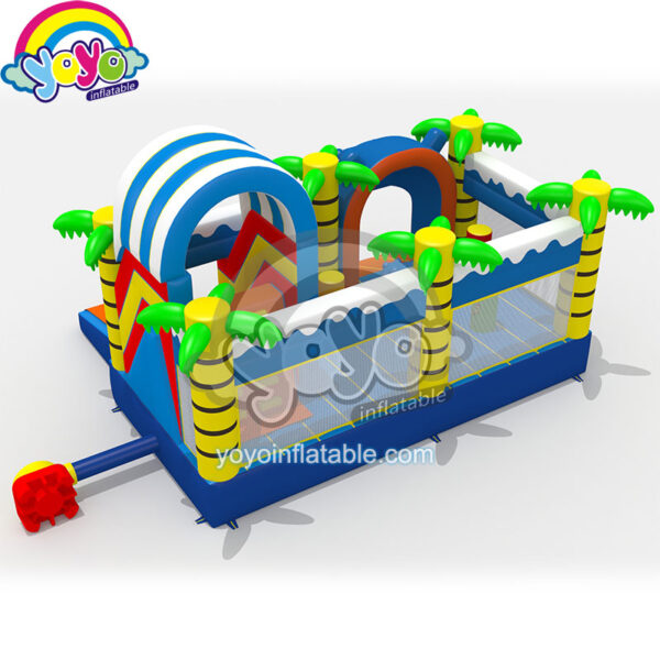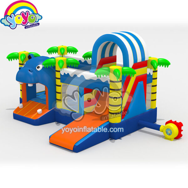 So nice the 20ft inflatable coconut and hippo combo is! The shape of pillars is like a coconut tree. There are three pillars in jumping area. A cute cartoon hippo with its mouth wide open. The wall is around with white net. The material is fire restardant heavy duty vinyl.