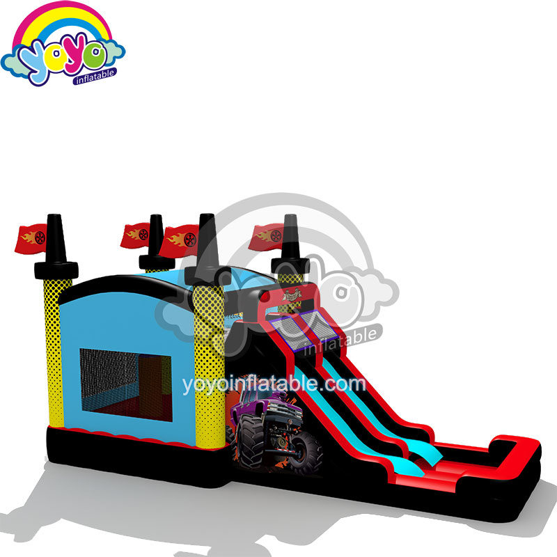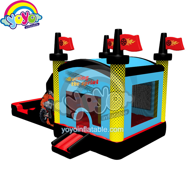 28ft Inflatable Car Theme Wet Combo. The top of the pillars has 4 flagpoles. It is very bright when you see from the long distance. And Kids love car theme. Emergency exit each enclosed-roof bounce. Business card holder sewes on units.