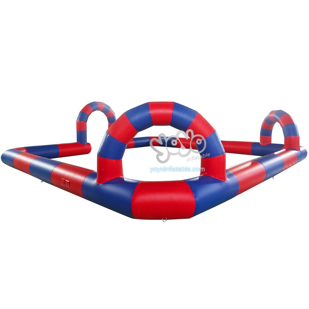 Featuring a vibrant red and blue color scheme, this 30ft inflatable racing track immediately captures attention with its thick, durable tubes designed for long-lasting performance. The 9×9 meter square layout includes charming arch entryways, creating an engaging environment for kid’s kart and bumper car adventures.