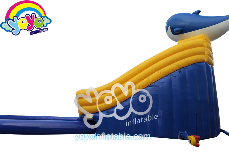 The whale theme inflatable water park consists of a giant water slide and a big round swimming pool. This whale water slide is triple sliding lanes design, with two fun climbing walls. If you want to enjoy this tall and exciting water slide, you have challenge the tall climbing wall first. But don’t worry, the bottom is a swimming pool so it’s OK to fall off. A giant inflatable whale cartoon on the top, very eye-catching and attractive for both children and adults. This big swimming pool is 20 meters in diameter and one meter height. Water slide material uses 15oz pvc, swimming pool uses 0.9mm pvc fabric, super strong and durable for commercial use.