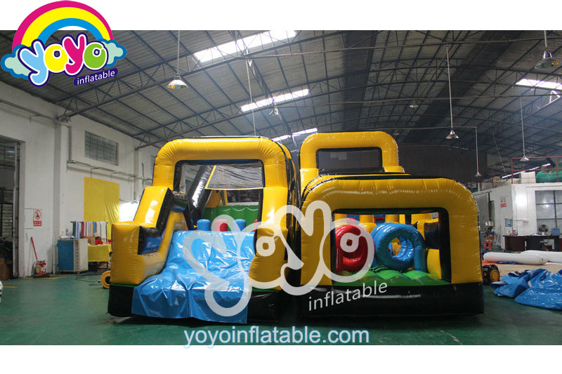This super fun and popular U-shaped inflatable obstacle course is very exciting and attractive for children. As you can imagine, this challenging obstacle structure has a lot of fun and safe obstacle games inside, like two lone circle fries tunnels at the entrance, multiple climbing walls and slides, even jumping cliff with air cushion, not to mention a lot of obstacle pillars. The inflatable structure is made into eye-catching black and yellow strriped style with commercial grade 15oz pvc material. Very strong and durable for commercial use.