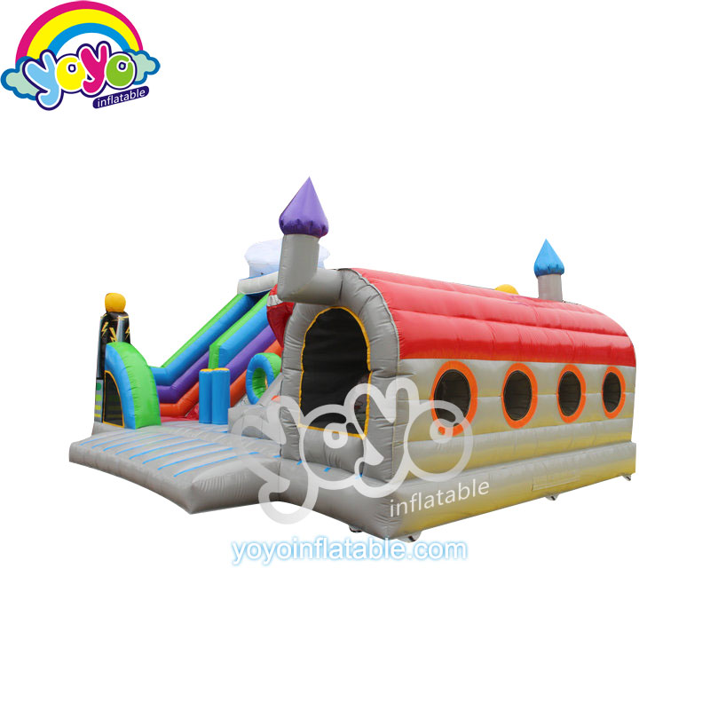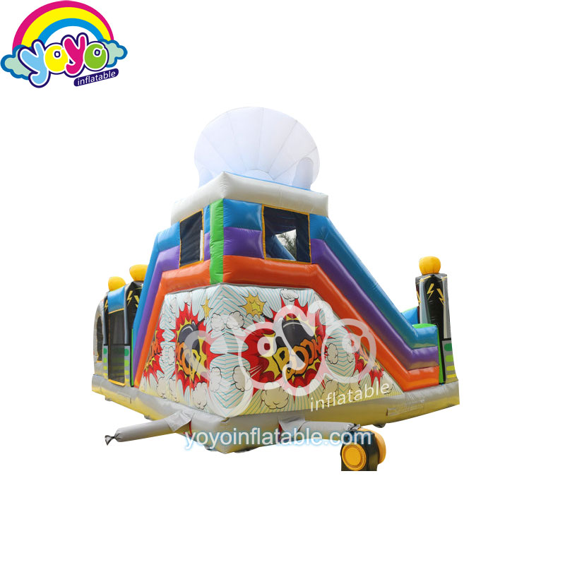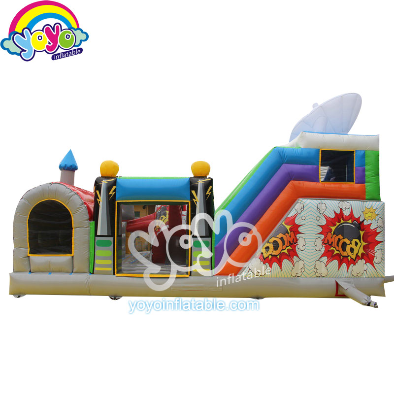 This air base theme inflatable amusement park includes two popular elements for children, the super cool airplane and missile. Inside this air base, you can see a big inflatable plane parking in the bouncing yard, the left side is a tall inflatable slide with an inflatable radar on the top, and the right side is an indoor obstacle, designed into a warehouse, filled with fun obstacles. The airplane in the center is also a small inflatable slide for children. So they can have fun with friends for all day long with so many different toys and games. Best unit for children’s birthday parties and school’s outdoor activities.