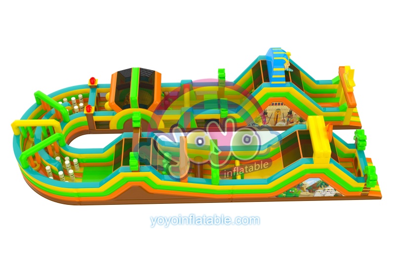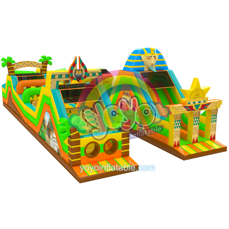 This ancient egypt obstacle course bounce house features a u-shaped design that spans five thrilling sections, all seamlessly connected with velcros for easy setup. With an enchanting ancient egypt theme, our original design inflatables bring the mysteries of the pyramids and temples to life. The lush green hues, complemented by yellow and blue accents, create a vibrant and immersive atmosphere.