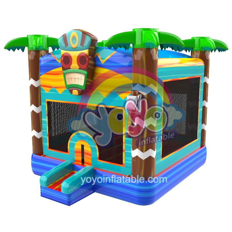 Step into a world of ancient mystery with this tribe theme inflatable bouncer, where tribal motifs and rugged textures ignite imaginative play. Its cube-shaped structure features palm trees, a bold inflatable axe and a striking tribal mask design atop the entrance, evoking the allure of a hidden jungle realm. Crafted from marble materials in blues, browns and yellows, this commercial-grade bounce house blends adventure with safety—reinforced mesh walls let parents monitor kids, while velcro closures and a low-rise step ensure easy access.