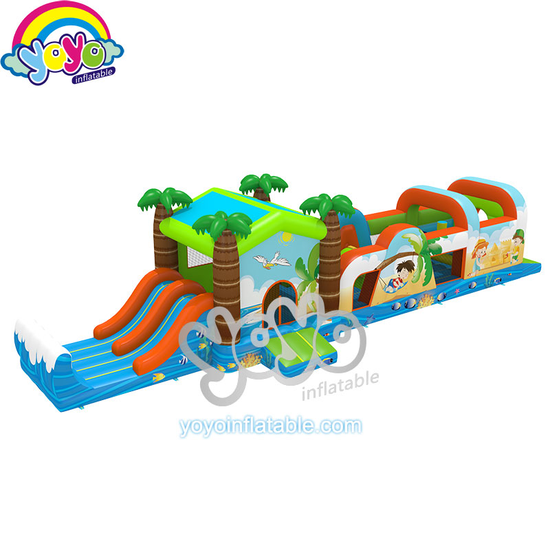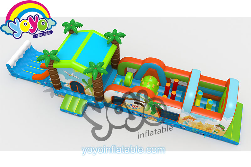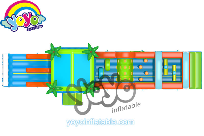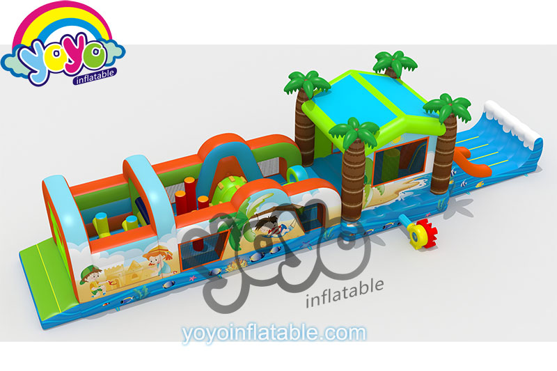 This 53 feet long inflatable obstacle course is designed with the comfortable beach theme, specially for little kids. The front part has many small obstacle games, like pillars, fence door, climbing walls and tunnel, etc. And the back part is a big bounce house with slide combo. This bounce house is designed with four coconut trees as the columns, and the slide has a big wave as the bumper wall at the finish line. The whole inflatable structure is super fun and safe for children, remind them they are have fun like enjoying a holiday at the beach. Conatct yoyo to customise a special and unique theme with this fun obstacle course design.