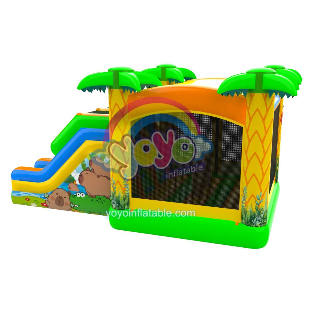 Meet the latest capybara-themed dry combo—this delightful bounce house slide combo merges a roomy bounce zone with an exciting slide for nonstop kid joy. A zippered entry on one side of the bounce area allows easy opening and closing; flanking the entry pillars are two adorable capybaras, one balancing a coconut on its head for extra whimsy. Mesh panels line the bounce house sides for clear internal visibility, while palm tree accents adorn all four corners to boost the tropical feel.