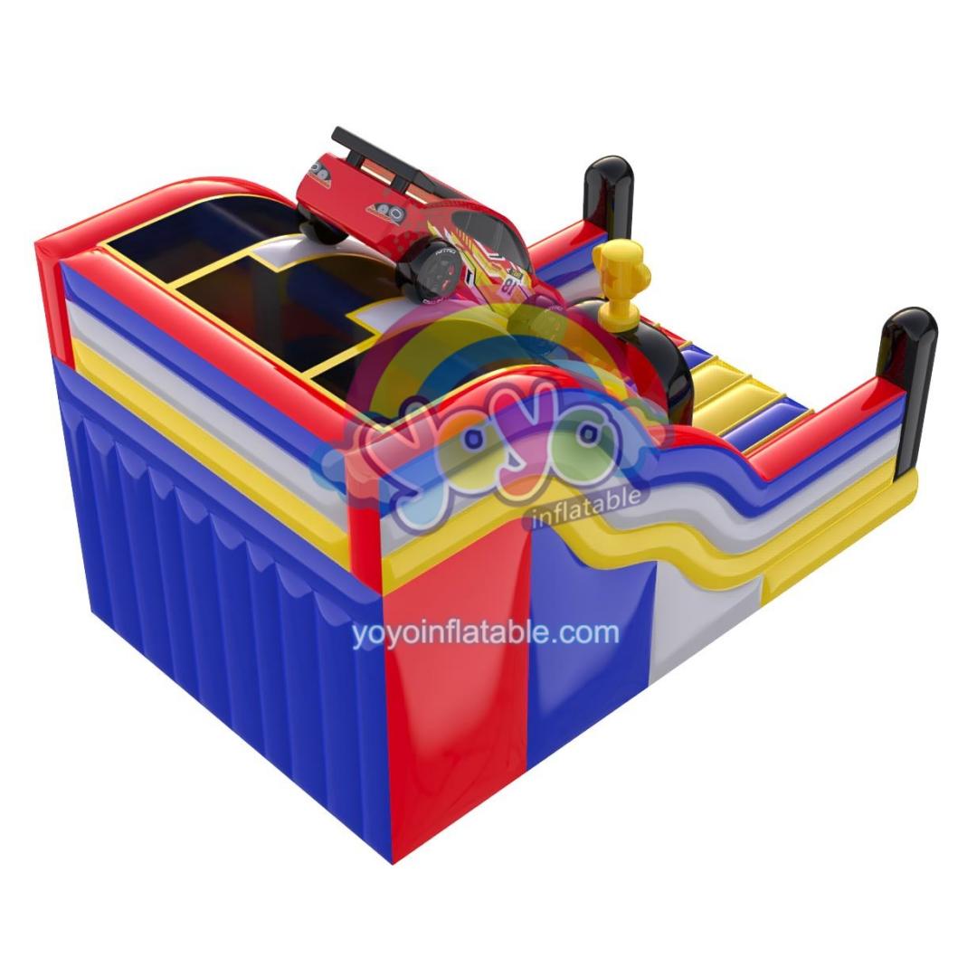 If there was ever an appropriate theme to describe the fun and excitement of an inflatable slide, it would be the racing theme. This giant car racing theme inflatable slide is a double lanes design, total 17 feet tall with a big inflatable racing car cartoon on the top of sliding lanes, symbolizing that players will rush down from top to the bottom like this racing car. The bottom is designed with a large buffer area, so players can land safely after rushing down the slide.