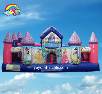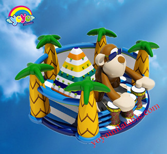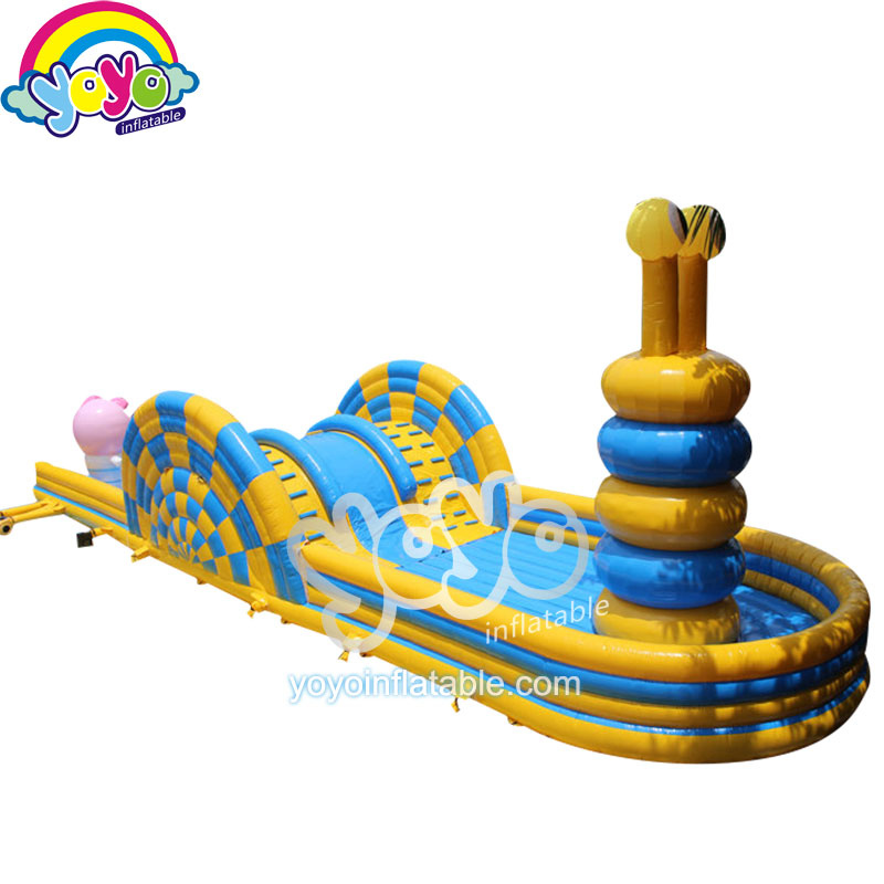This fun inflatable amusement pake is a super cool obstacle course design, with a space cartoon pig theme. You can see this giant inflatable pig cartoon standing at the start line, raising its arm and points to the direction where you should go. Players can run and get through the pillar forest, then climb up the giant arched wheel in the middle, run to the end and go around the pillar and then run back, get through all the obsatcles to get to the start line. This game is perfect for kids who want to have a friendly competition with their friends.