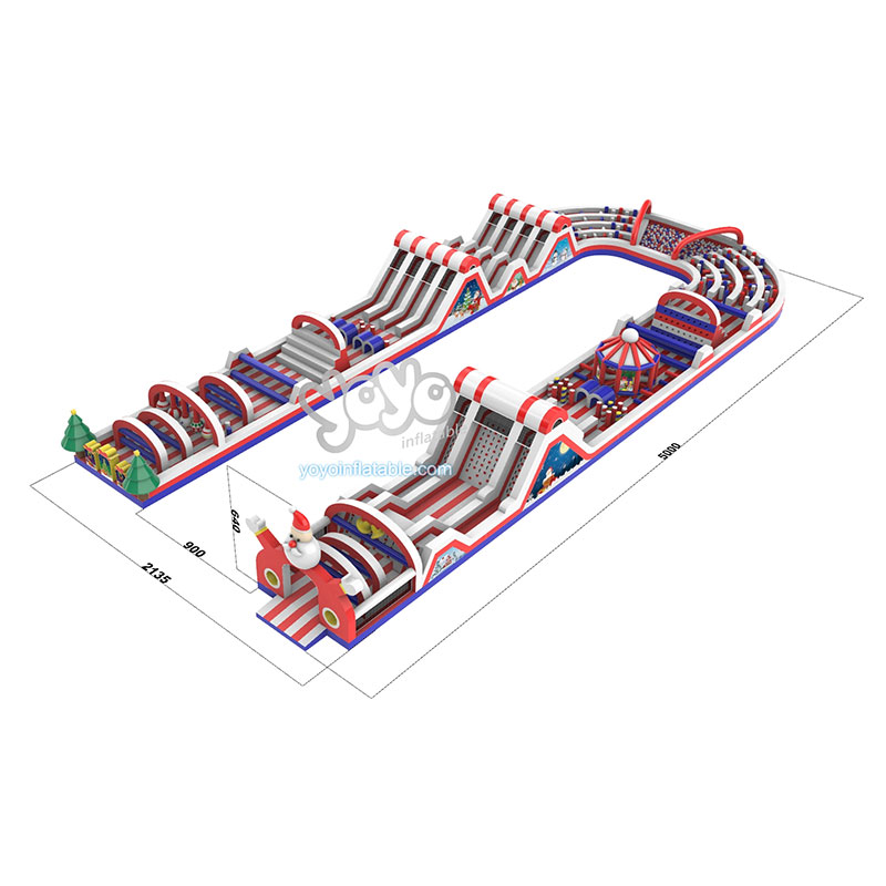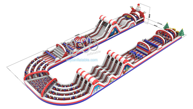 This Christmas theme inflatable obstacle course is designed in a captivating U-shape, perfect for kids of all ages. Enter this obstacle course from the santa claus entrance, navigate through dense obstacles, conquer challenging climbing walls, and slide down huge slides, all this will give children a happy holiday.