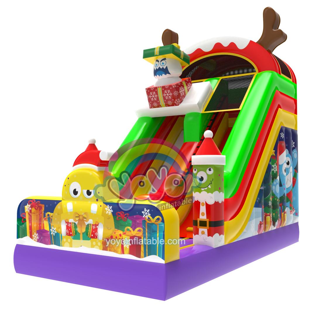 Delight children with this unique inflatable dry slide, where festive cheer meets playful monster fun. Measuring 6 meters long and over 5 meters high, its single lane features reindeer antlers and a cute snowman monster emerging from a gift box. Vibrant pillars at the base showcase two Christmas-clad monsters in green and mint, complemented by a cheerful yellow monster holding gifts on the stop wall.