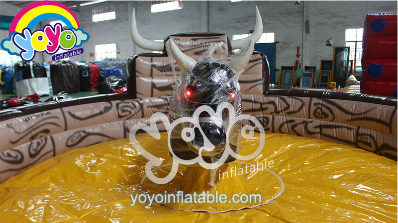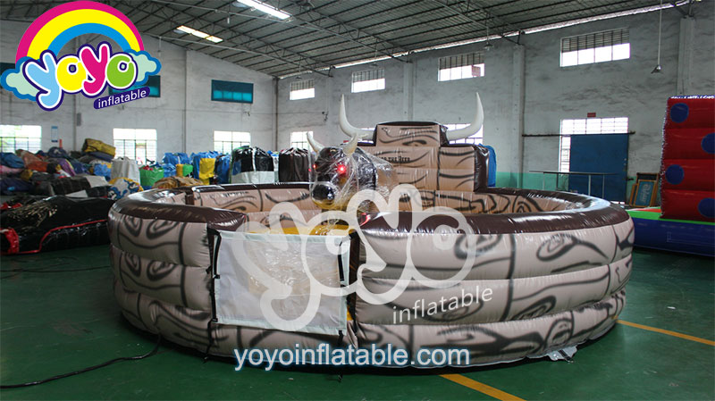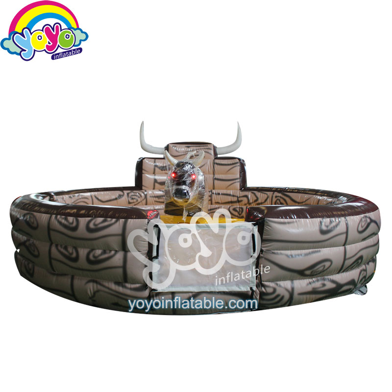 This classic wood grain design mechanical bull riding game is very popular for parties, events, carnivals and fairs. Both children and adults can enjoy this exciting rodeo bull riding game. A super cool mechanical bull in the center for people to challenge. This rodeo bull can be customised into a mechanical shark, giant football or other animals. Large inflatable landing floor with high inflatable walls for protection, automatic control cabinet for different levels of players. The round wall is designed with a bull horn part for decoration, with strong anchoring D-rings at the bottom, this mechanical bull equipment is pretty safe and fun.