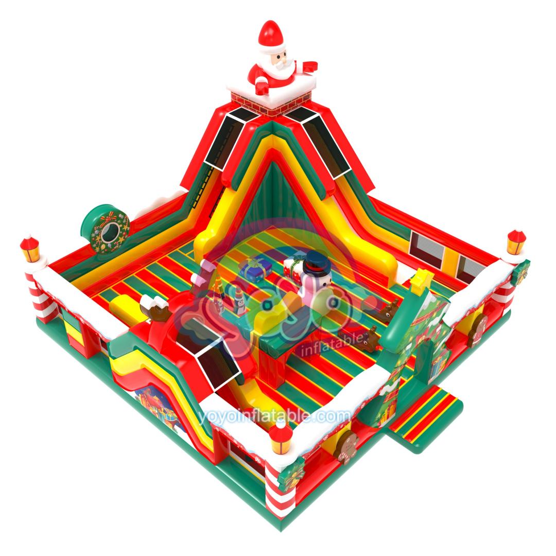 Captivate crowds with this immersive commercial Christmas inflatable theme park, measuring nearly 10×10 meters and towering 7 meters high. Its festive entrance is shaped like a Christmas tree, while mesh walls offer clear visibility and reveal vibrant interior decorations like jingle bells and lamp posts. The design features snowy accents on the wall and includes a main slide topped with Santa on a chimney, a secondary slide with reindeer antlers, plus a gift box tunnel, reindeer rocker and playful snowman figures.