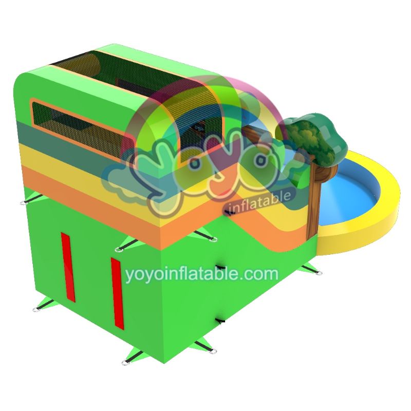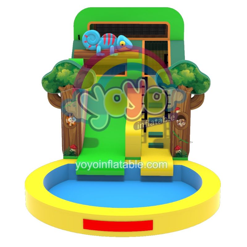 This commercial jungle adventures inflatable water slide features a lizard perched above the slide, tree trunk bases housing playful squirrels, and vibrant sun-drenched canopy yellows, greens, oranges. Integrated splash pools eliminate setup, while safety nets + velcro hose clips (for water jets) ensure thrilling yet secure rides. Commercial-grade material withstands splashes and sun.