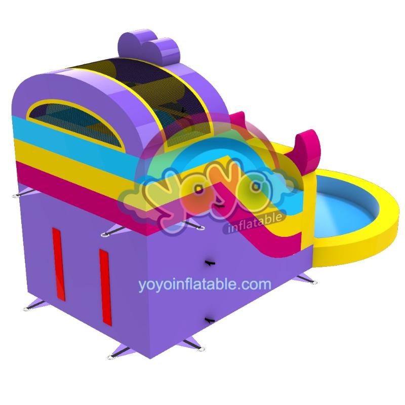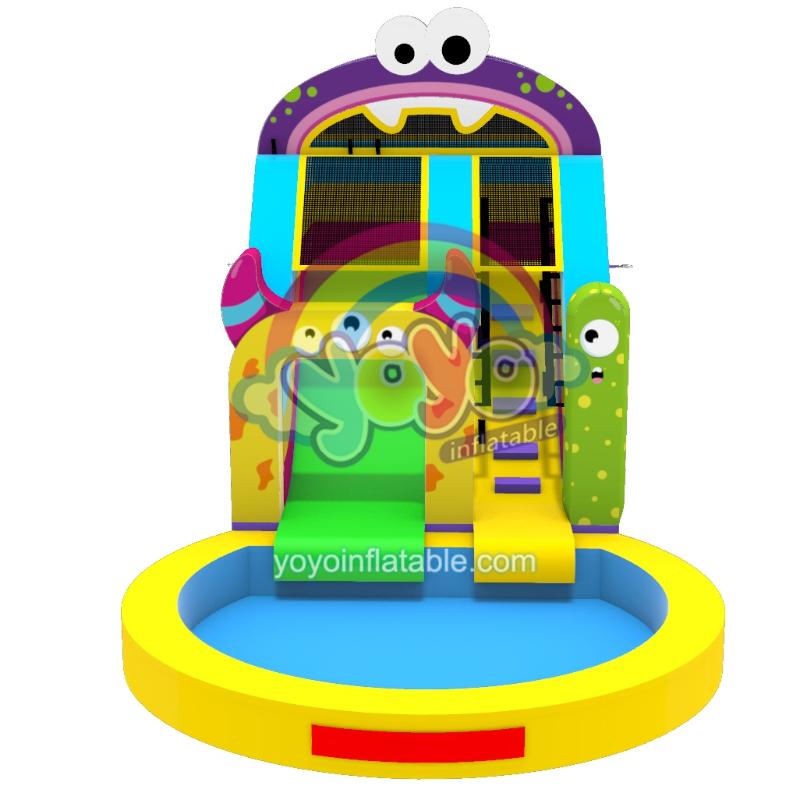 Unleash monstrous summer fun with the commercial monster themed inflatable water slide, where vibrant blues, yellows, purples and rose reds collide in a kid-friendly beastly adventure! A single slide curves through a horns monster arch, while a domed roof with creature graphics and safety nets shields players. The integrated splash pool features two-tone color matching, and reinforced seams ensure stability during wild descents. Every inch—from the reinforced climbing steps to the commercial grade pvc—is built for giggles and safety.