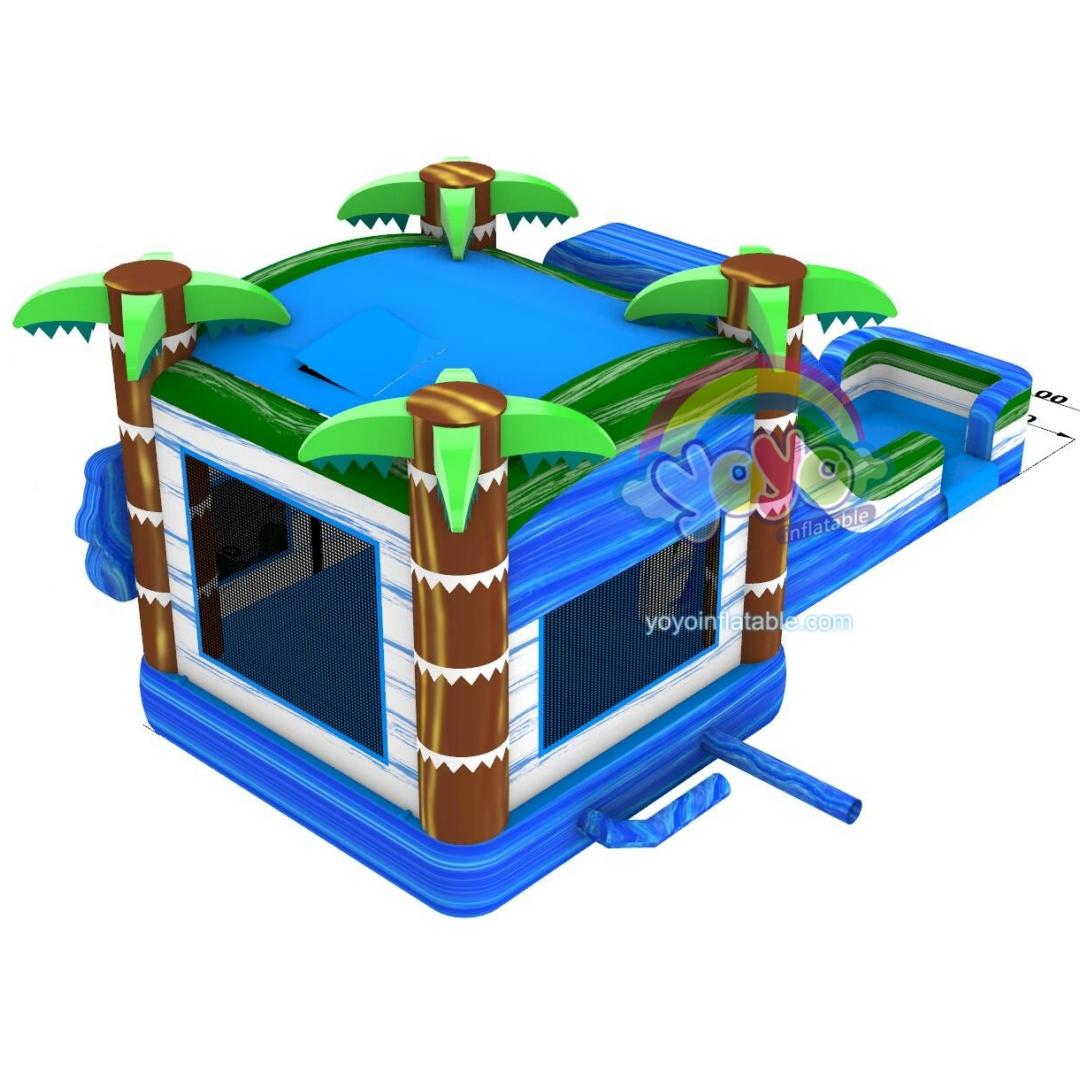 Our wet dry combo bounce house combines a playful crocodile theme with premium marble pvc, similar as Alligator Family Inflatable Wet Dry Combo YY-WCO241004, featuring a fresh blue-white-green color palette that captures summer vibes. The bounce area boasts realistic palm trees at all four corners, plus a zippered entrance flanked by crocodile decor and signpost accents marked “Slide” and “Funny.” A lounging crocodile tops the entrance, surrounded by pool float and beach ball prints to highlight its dual-use design.