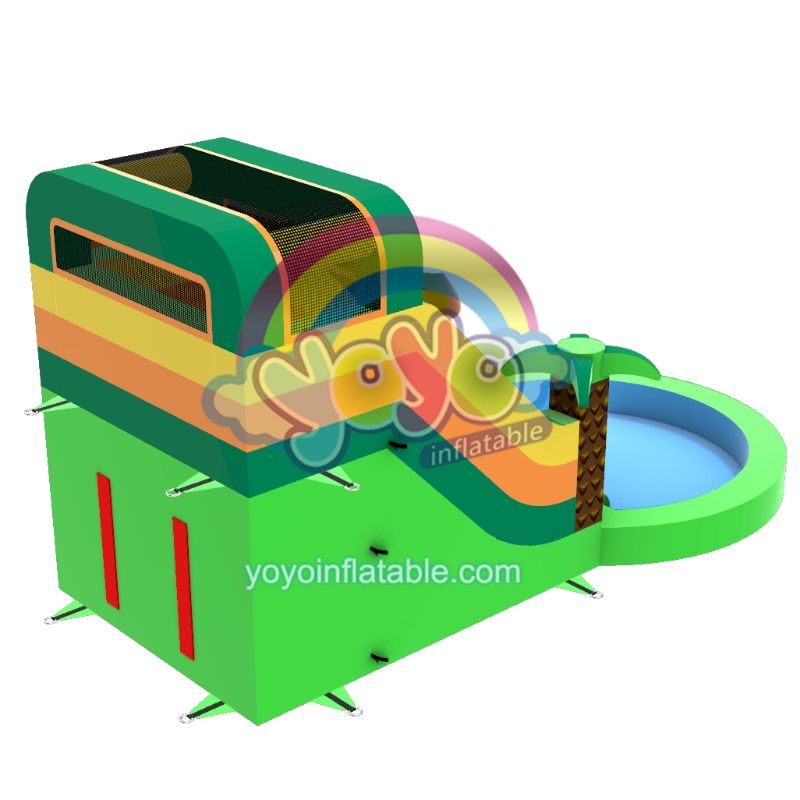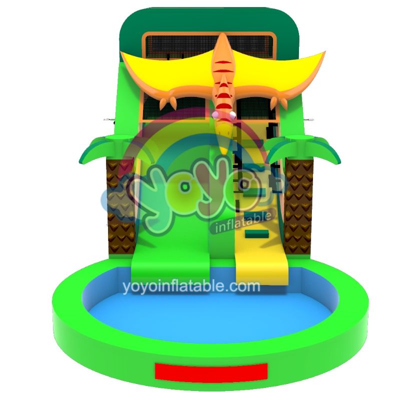 Journey back to prehistoric thrills with this dinosaur themed commercial inflatable water slide! This commercial water slide features a winged dinosaur atop its platform, flanked by two palm trees and jungle-inspired greens, yellows and oranges. An integrated splash pool eliminates setup hassles, while black safety nets shield riders. Non-slip steps and reinforced climbing blocks ensure secure adventures through primeval landscapes.