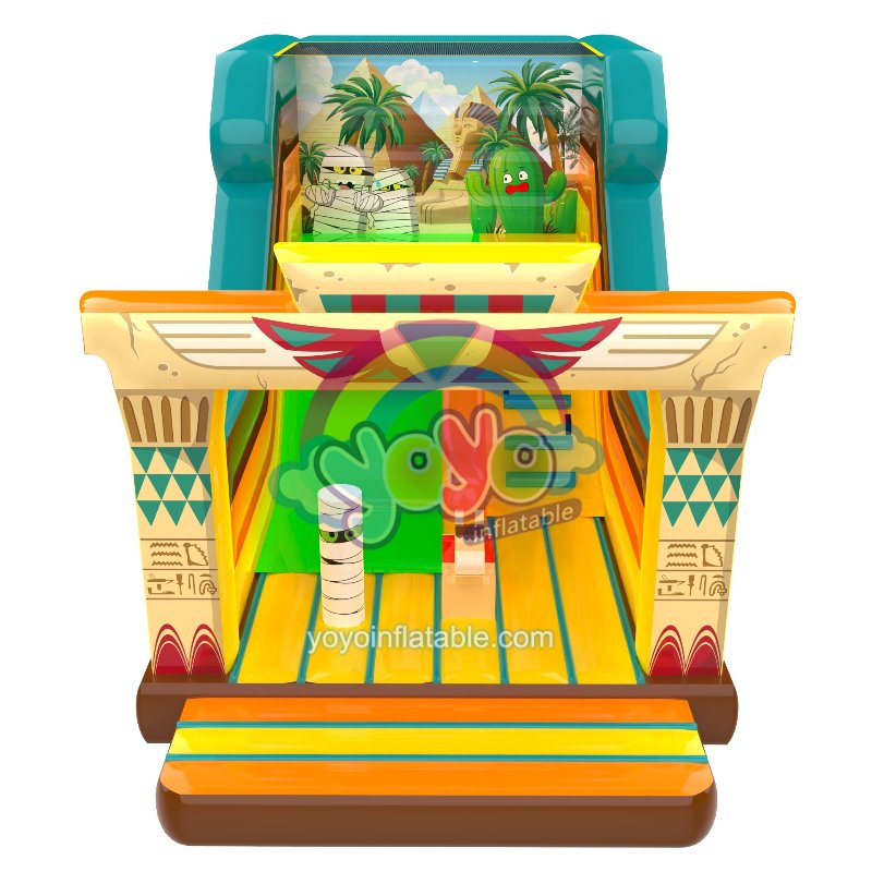 The vibrant desert color scheme of yellow, orange, deep green and brown sets the stage for an epic adventure. Detailed graphics of pyramids, mummies and sphinxes on the grand entrance arch and background panels ignite young imaginations. This original design isn’t just visually stunning; it’s built for shared fun with a wide, single-lane slide that safely accommodates two children simultaneously, making it a standout attraction for any event.