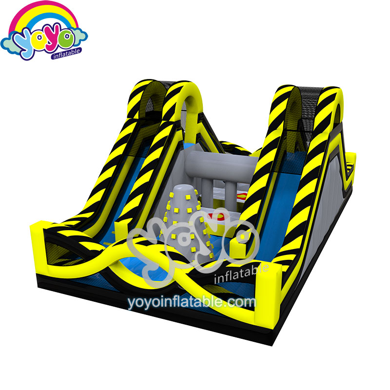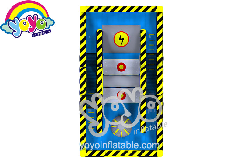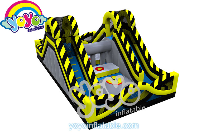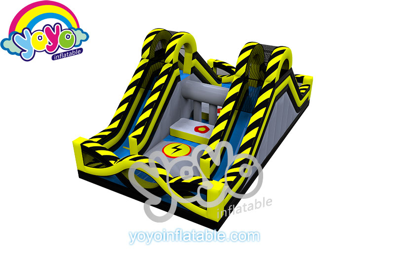 This giant inflatable playground structure is designed with the eye-catching electric hazard theme, you can see the elextric sign everywhere, remind kids that this is not a safe game but a challenging obstacle course. The structure design is very simple, two inflatable slides on both sides for climbing up and sliding down, a giant inflatable balance beam between these two slides, with two inflatable cushions on both sides. And the front bounce area has a big soft air bag with electric sign printing on top, the other side has a tall inflatable climbing wall. Very fun and exciting for children.