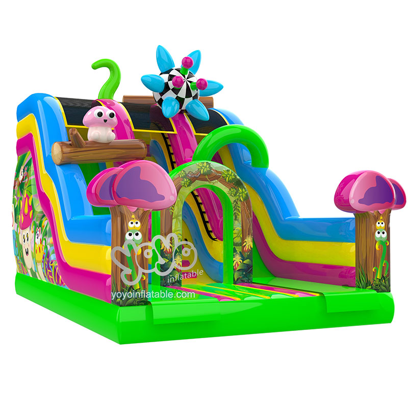 Crafted with vibrant blues, greens, yellows and pinks, this forest themed inflatable slide features a unique design that’s both playful and safe, and can bring you into a fantasy forest world for a good adventure. The towering big flower, wooden and cute mushroom on the top of the slide also adds a touch of forest atmosphere.
