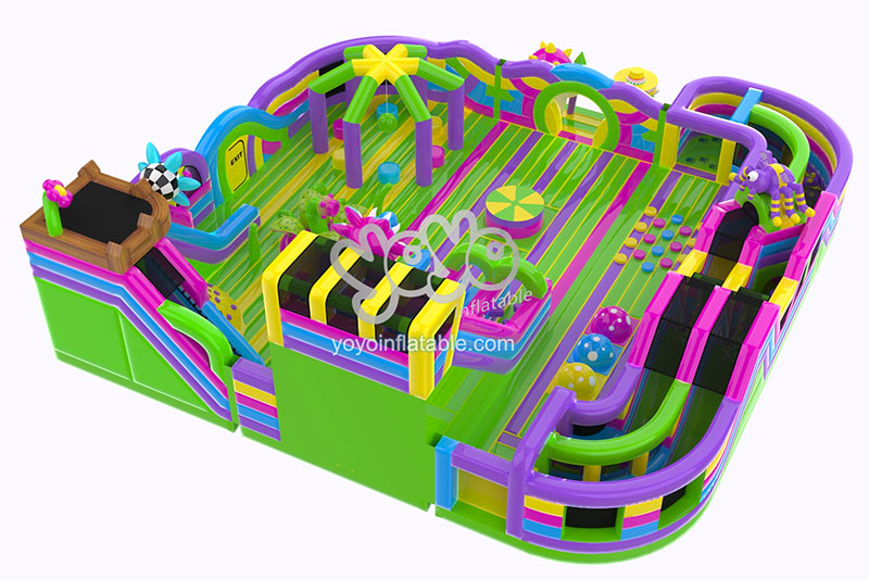 Same design as our another Fantasy Rainforest Inflatable Theme Park but different color. Colorful inflatable theme park full of stunning array of hues – purple, green, yellow, pink and blue, creating a visual feast for the eyes and it’s more attaractive by chilldren. Crafted with meticulous care from sturdy materials. Decorated with charming cartoon animal patterns, it’s a playful ode to nature’s wonders.