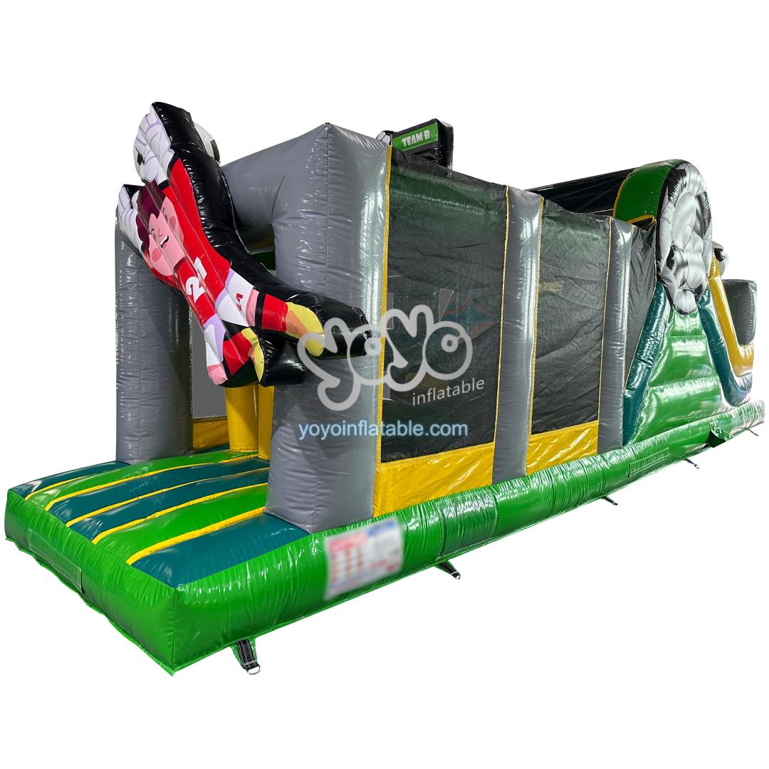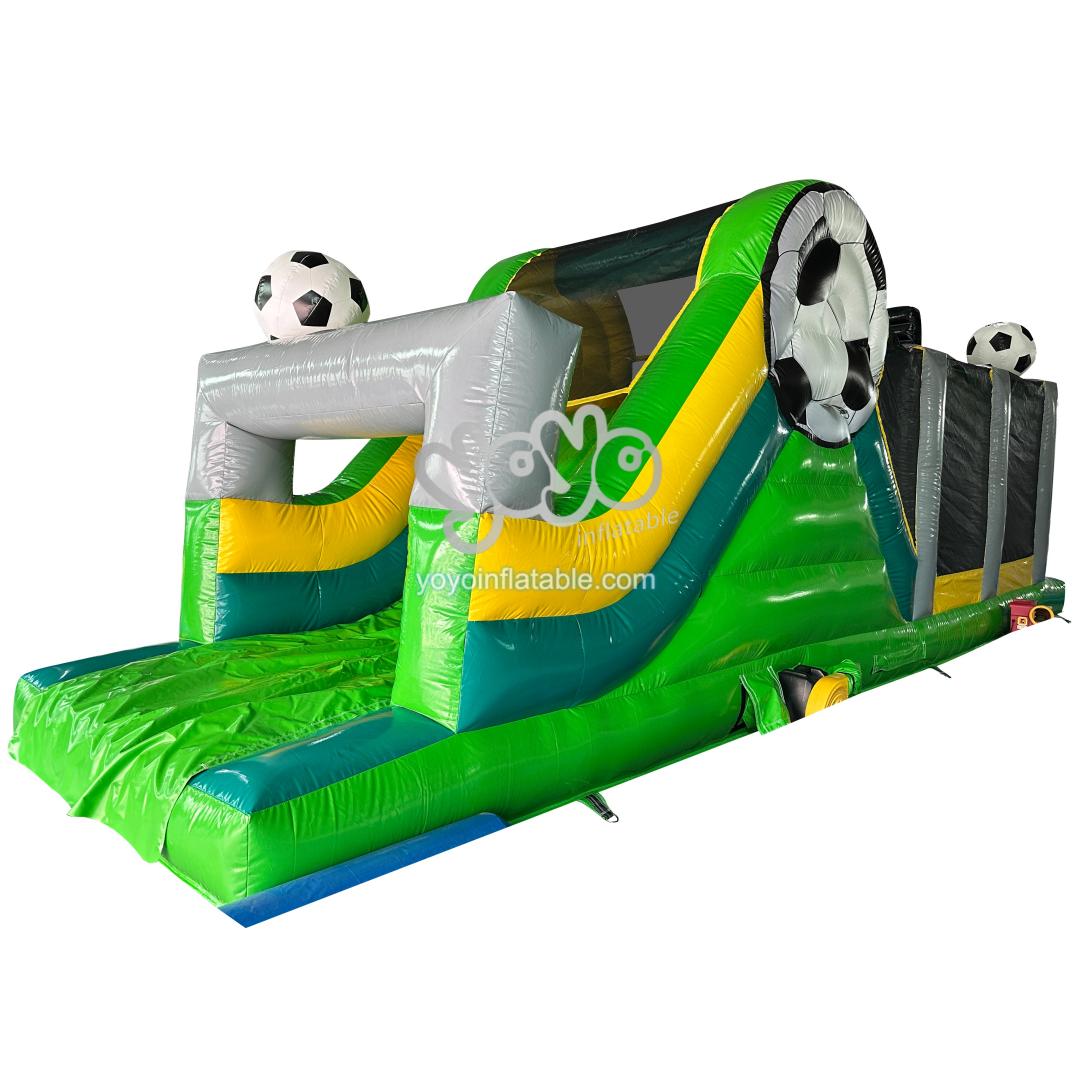 Designed for action, its vibrant green “pitch” with strategic yellow and gray accents encourages active play. Players navigate the field, racing under the watchful net, before a triumphant descent down the slide adorned with a massive soccer ball printing decor. This inflatable obstacle promises endless hours of energetic entertainment, making it the ultimate reward for football-loving kids.