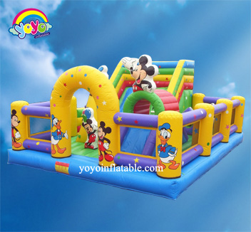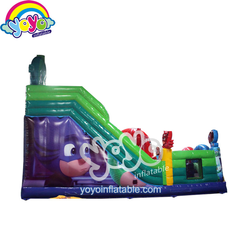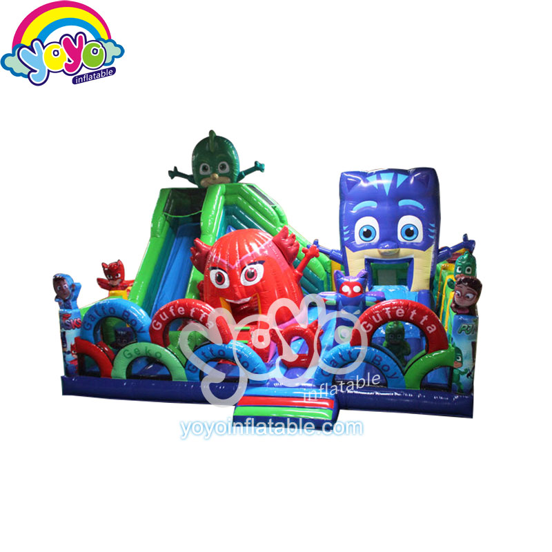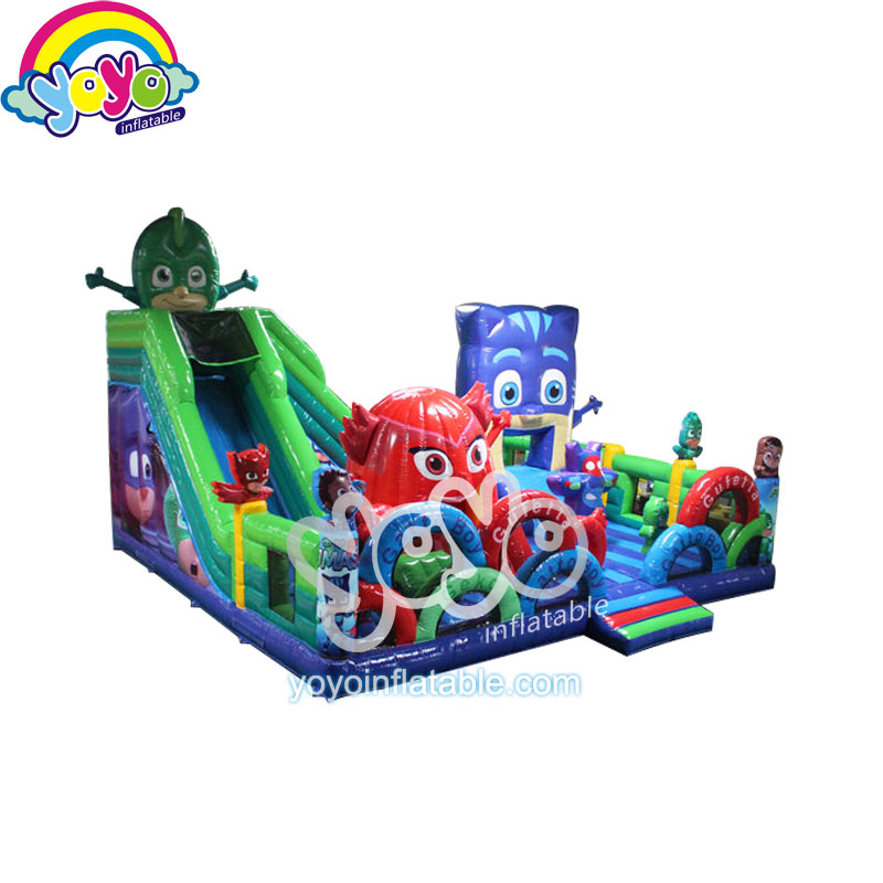 This great inflatable amusement park is designed with special cartoon theme – the PJ Masks. One of the most eye-catching designs is these two giant inflatable cartoons. The entrance arches also have the cartoon characters’ name printing on them, with many other characters’ smaller cartoons inside. This giant inflatable structure also has a big inflatable slide, with large bouncing area for kids to play superhero games with friends at their birthday parties. Anyway, you can always custom your own inflatable units with any cartoon themes you like.