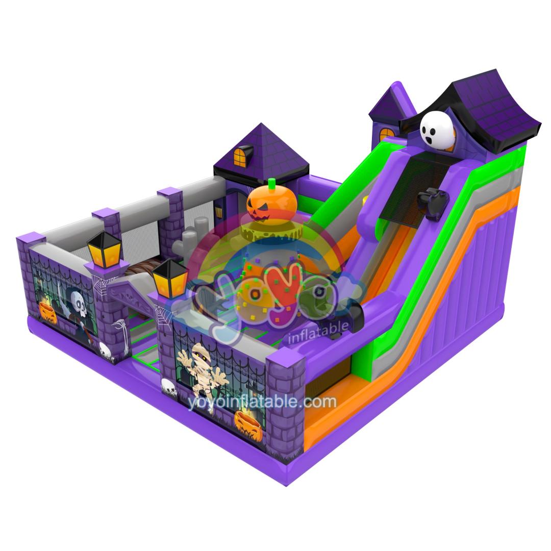 The thematic purple, black and gray exterior sets the stage, leading to an interior packed with adventure. Guests can conquer a multi-colored climbing tower crowned with a giant jack-o’-lantern, then zoom down a vibrant green slide flanked by castle towers and a playful ghost. Enriched with bats, skeletons and mummy graphics, every detail crafts a fully immersive experience.