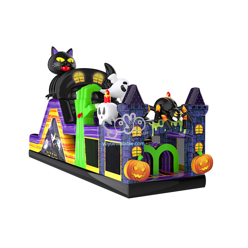 This enchanting halloween obstacle course, dominated by purple, yellow and black hues, adorned with eerie accents and festive Halloween decorations like pumpkin lantern, white ghost face doll, spider, skull and a green hand with eyes, invites children to a thrilling exploration filled with Halloween wonders. A colossal black cat watches over the proceedings, setting the eerie tone.