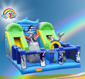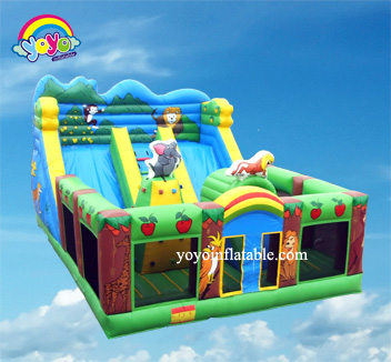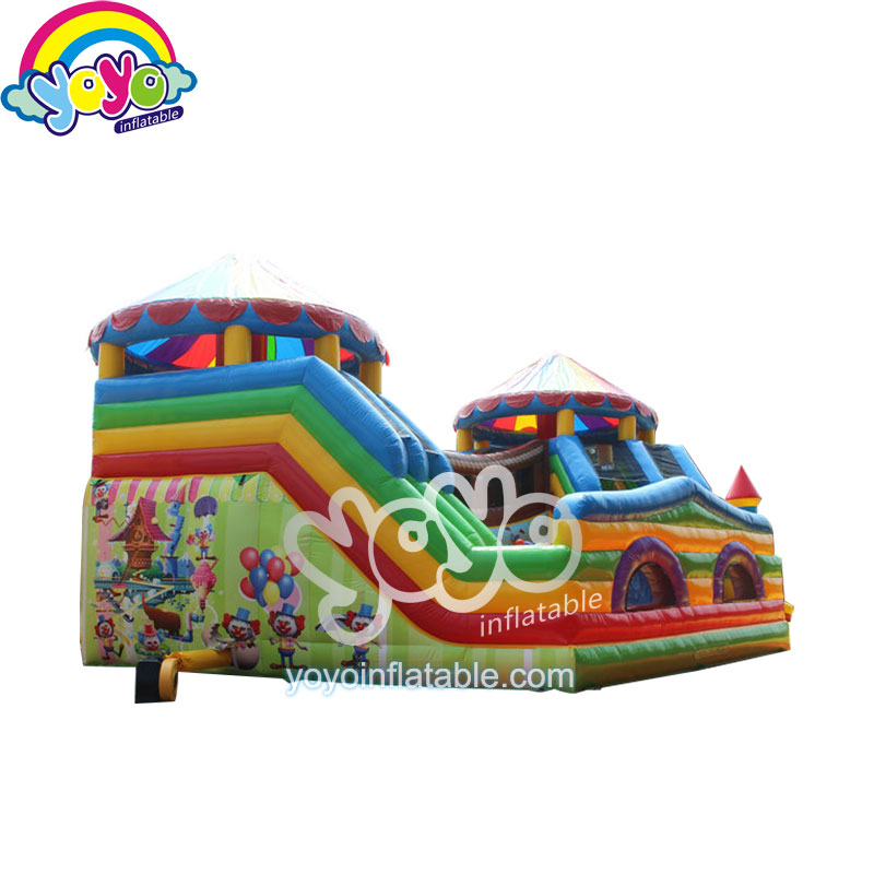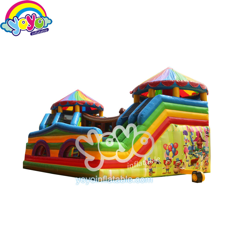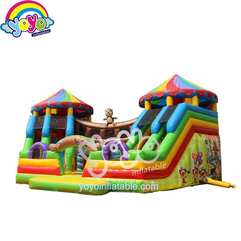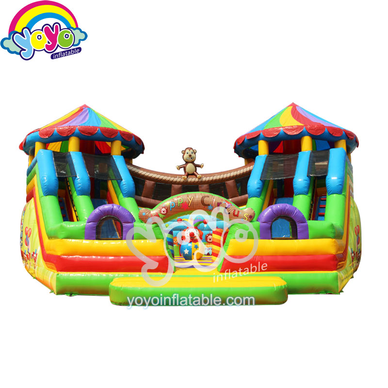 This happy circus theme inflatable amusement park is a super design. The most eye-catching part is these two giant inflatable slide as you can see at the first glance. A fun obstacle bridage is connecting the two slides on the top, with an inflatable monkey cartoon sitting in the middle. These two slides also have a circus tent design to shade players. In the from bouncing area, an inflatable clown cartoon with some pillars, in front of two tunnels under the monkey bridge. behind thes tunnels, there is another fun bouncing world. So kids can be entertained for hours with this super circus unit!