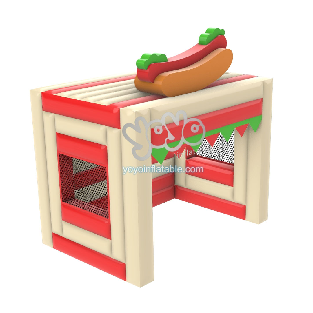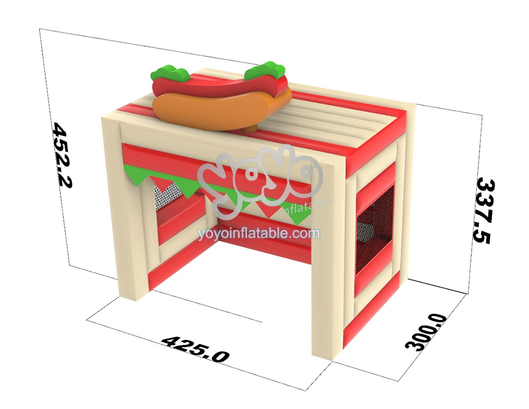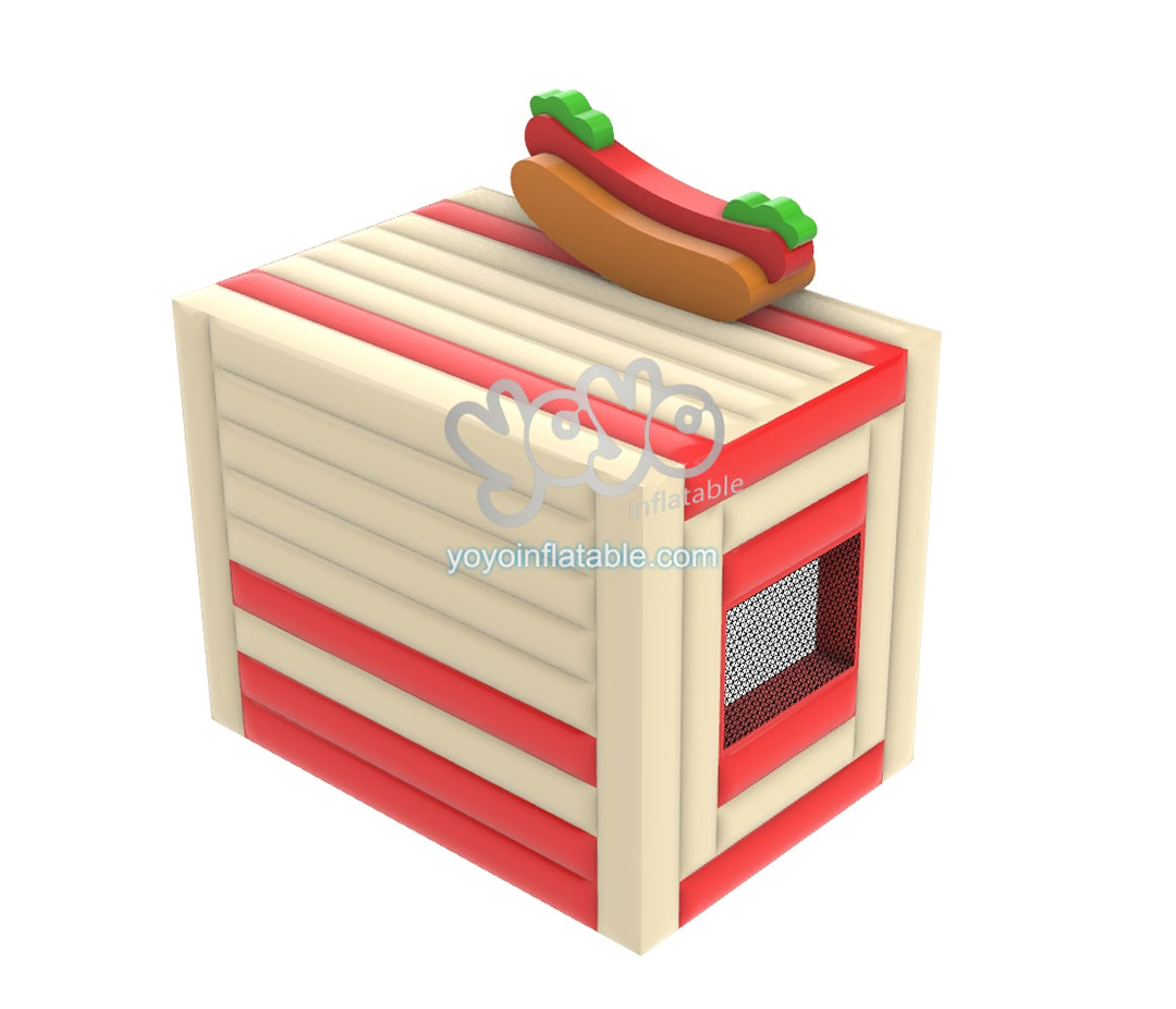 The entire structure and design can be customized according to your needs. For example, you can print your company names and logos on the surface of the inflatable walls, or just add a banner with the name of the special event. This inflatable hot dog on the roof can be easily replaced by other inflatable food like fruits or fried chickens. Just let me know what’s your business and we will make it right for you.
