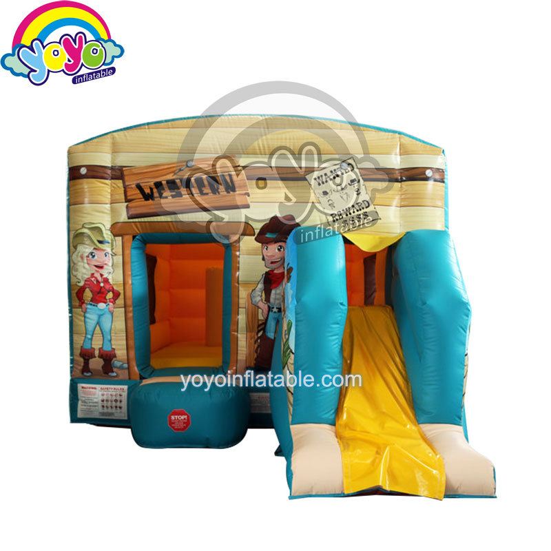 There are two pillar inside this inflatable cowboy combo with slide. There are windows on both sides of it. When you are jumping inside, you can see the outside vision. Exciting shootout is still not suitable. What kids need is a safe western cowboy inflatable combo with slide.