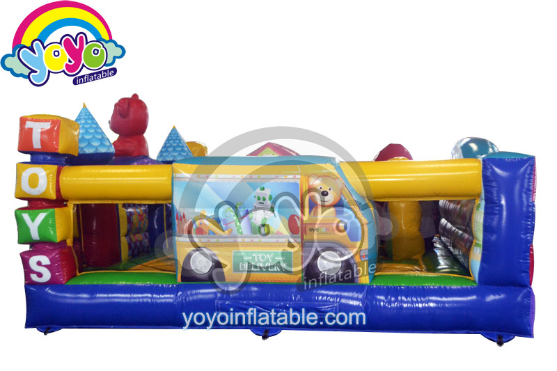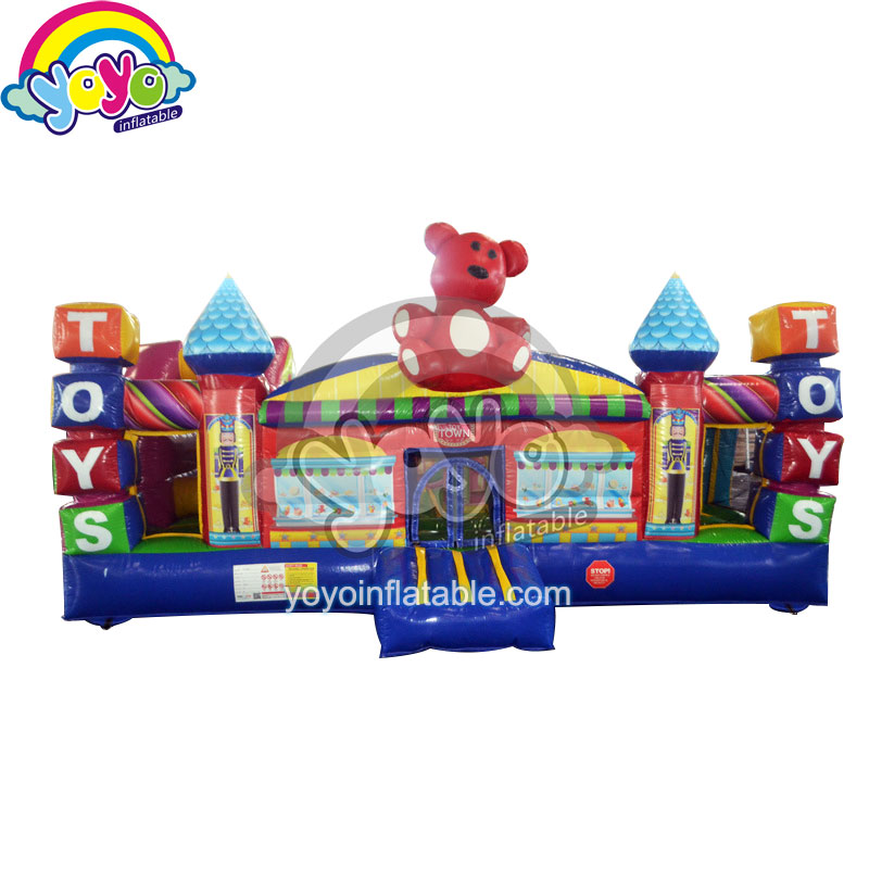 Look, the lovely cute bear is at the door to welcome the kids to the inflatable happy town amusement park.