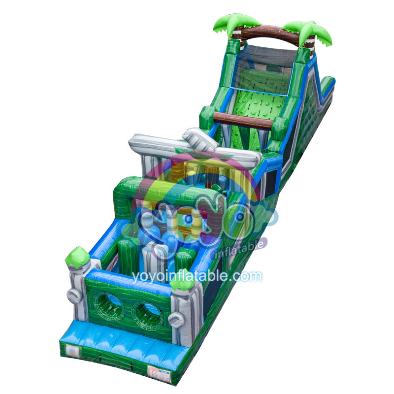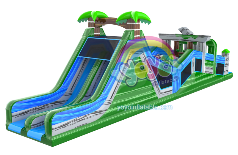 Unleash the adventurer within with our jungle ruins obstacle course bounce house, a thrilling fusion of original design inflatables tailored for endless fun! This inflatable obstacle course consists of two-parts, seamlessly connected by velcro to ensure stability and safety. Step into a world of adventure where ancient ruins meet lush jungles, designed to captivate young hearts and ignite their imaginations. The vibrant green blue and grey hues, complemented by towering palm trees on the top, transport you to a mystical realm, making every leap and bounce a memorable experience.
