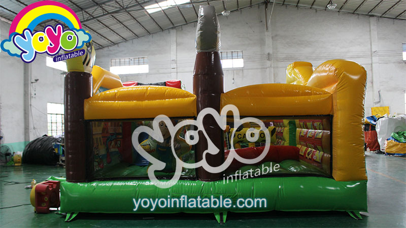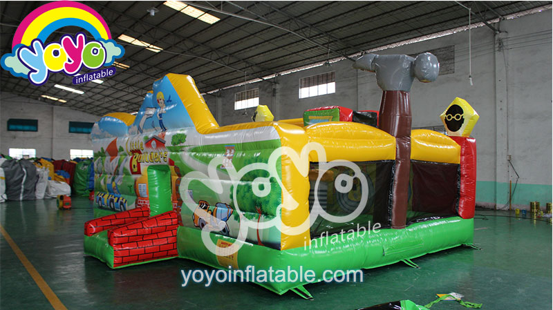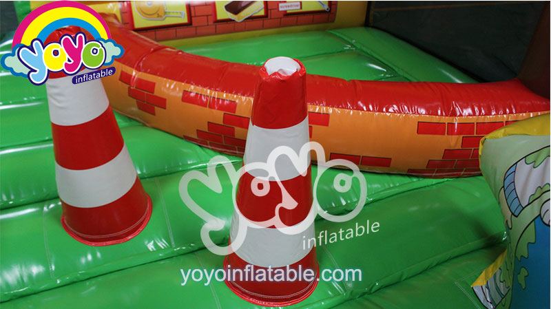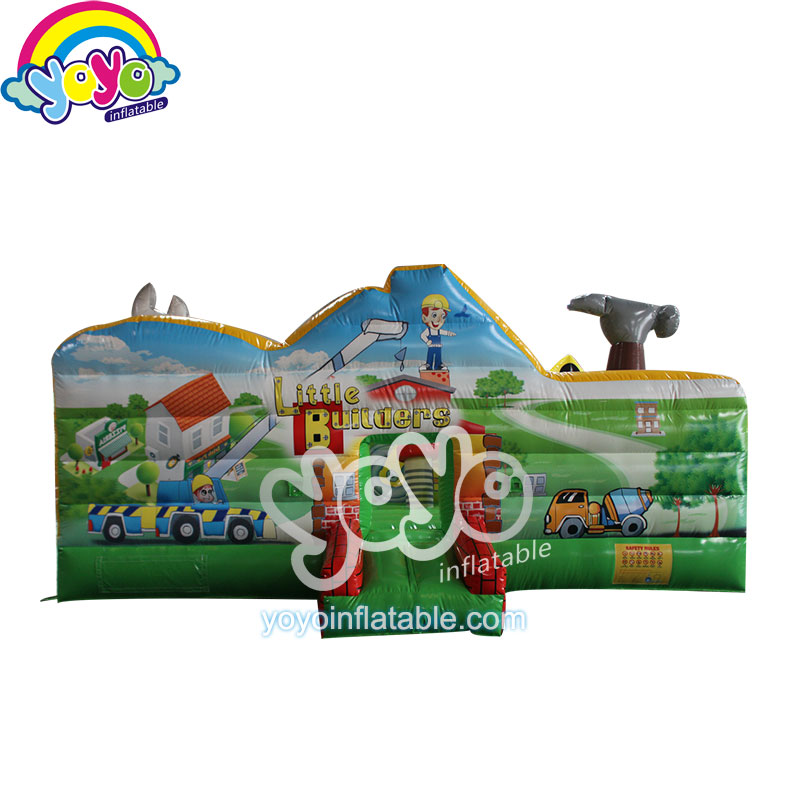 This great inflatable amusement park is designed with fun theme – the little builders. The front side is a tall inflatable wall with a house door style entrance. The cartoon character is standing on the roof and work with the building machines. The background is a full country picture of digital printing. Behind this high wall, you can see a giant inflatable hammer and wrench as the inflatable columns. Inside, there is a small ball pit and a slide, with many fun inflatable cone and screw obsatcles in the middle of the jumping area. Full themed digital printing on the surface to attract kids eyes. And the fun inflatables games keep children busy for hours. This is an amazing fun world for kids birthday parties.