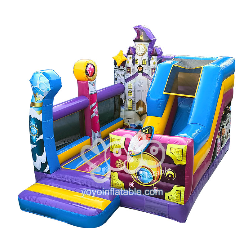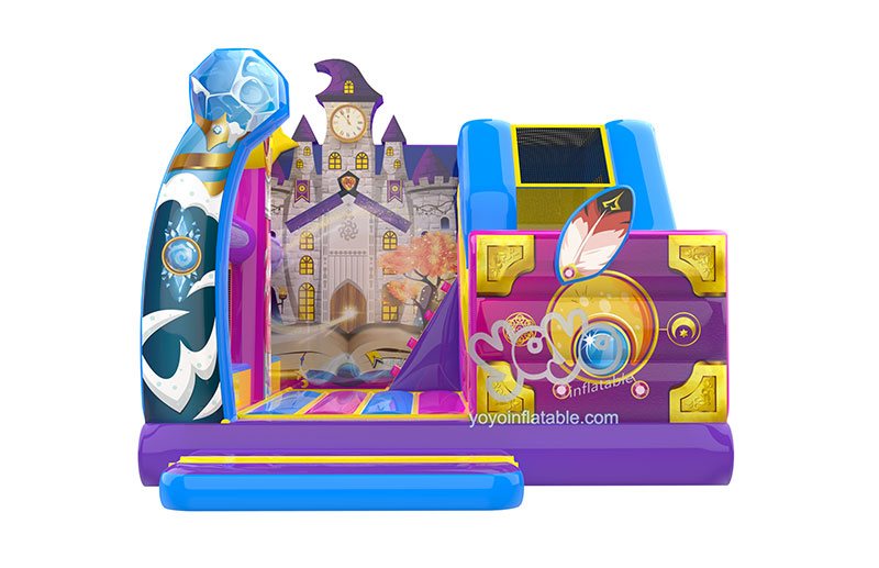 Adjacent to the castle stands a towering slide, adorned with similar whimsical designs, inviting children to race down in laughter. The entire setup creats a dreamlike atmosphere. Combo design provide double fun for players, including bouncing and sliding.