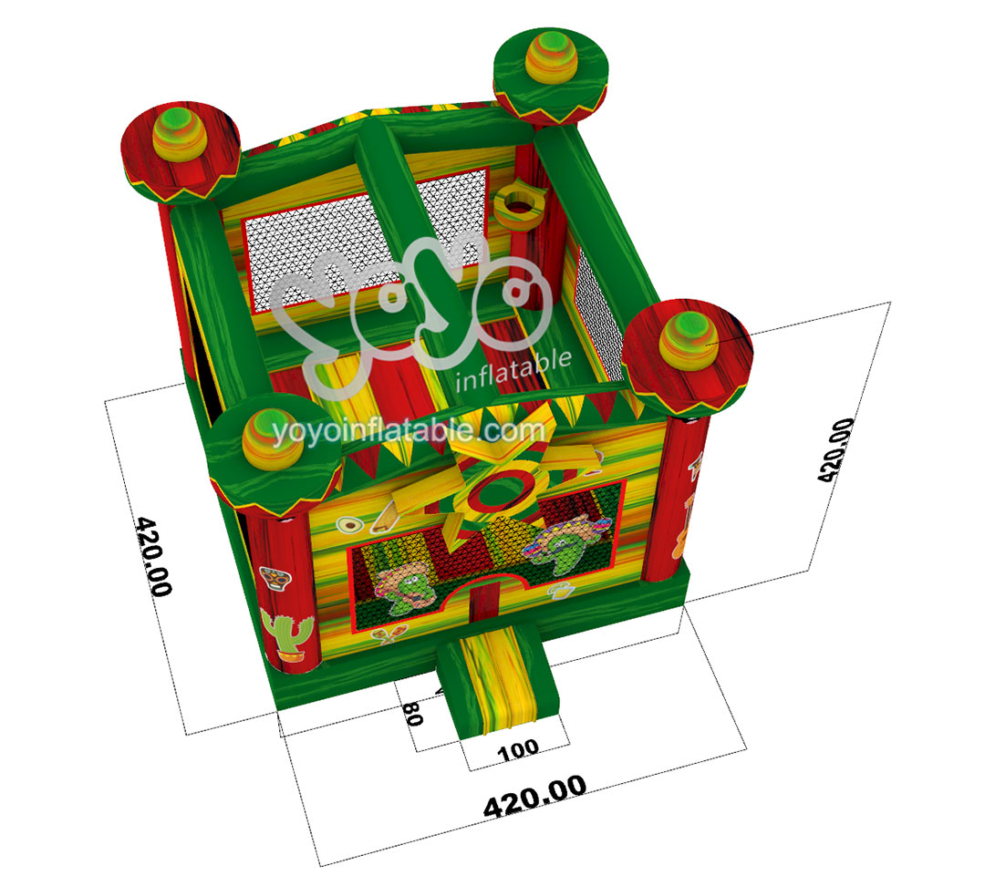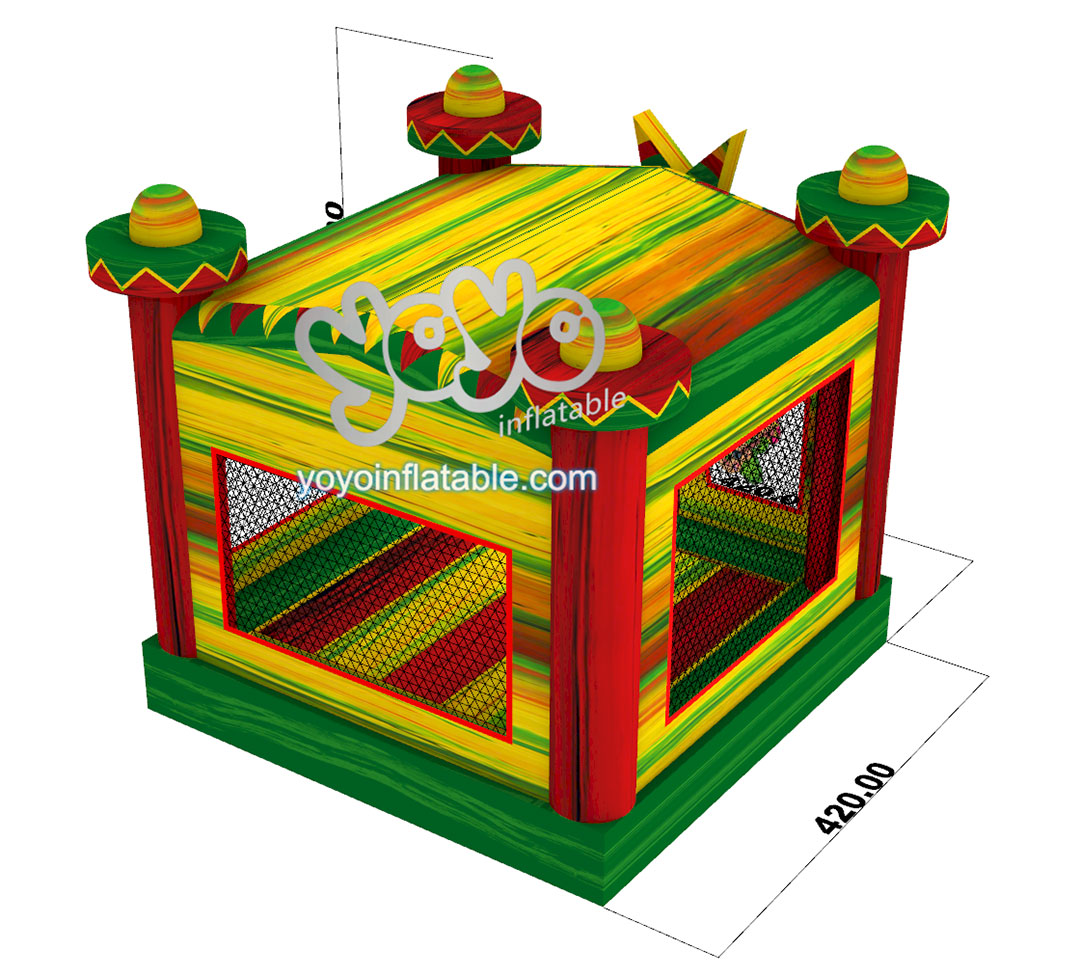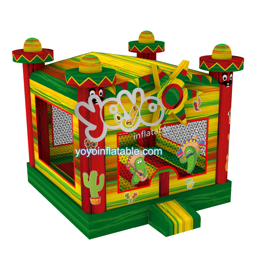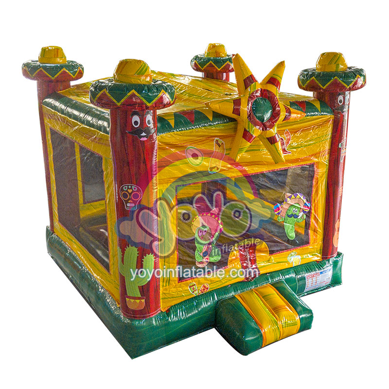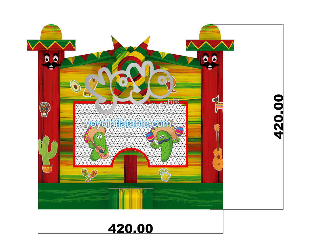 This new design Mexican Style Bounce House is one of our most popular inflatables for party rental business. The whole inflatable structure is used bright red, green and yellow colors to attract the eyes of small children. And the cartoons are Mexican man wearing sombrero and a bright sun in the front, with some Mexican ethnic style elements printing.