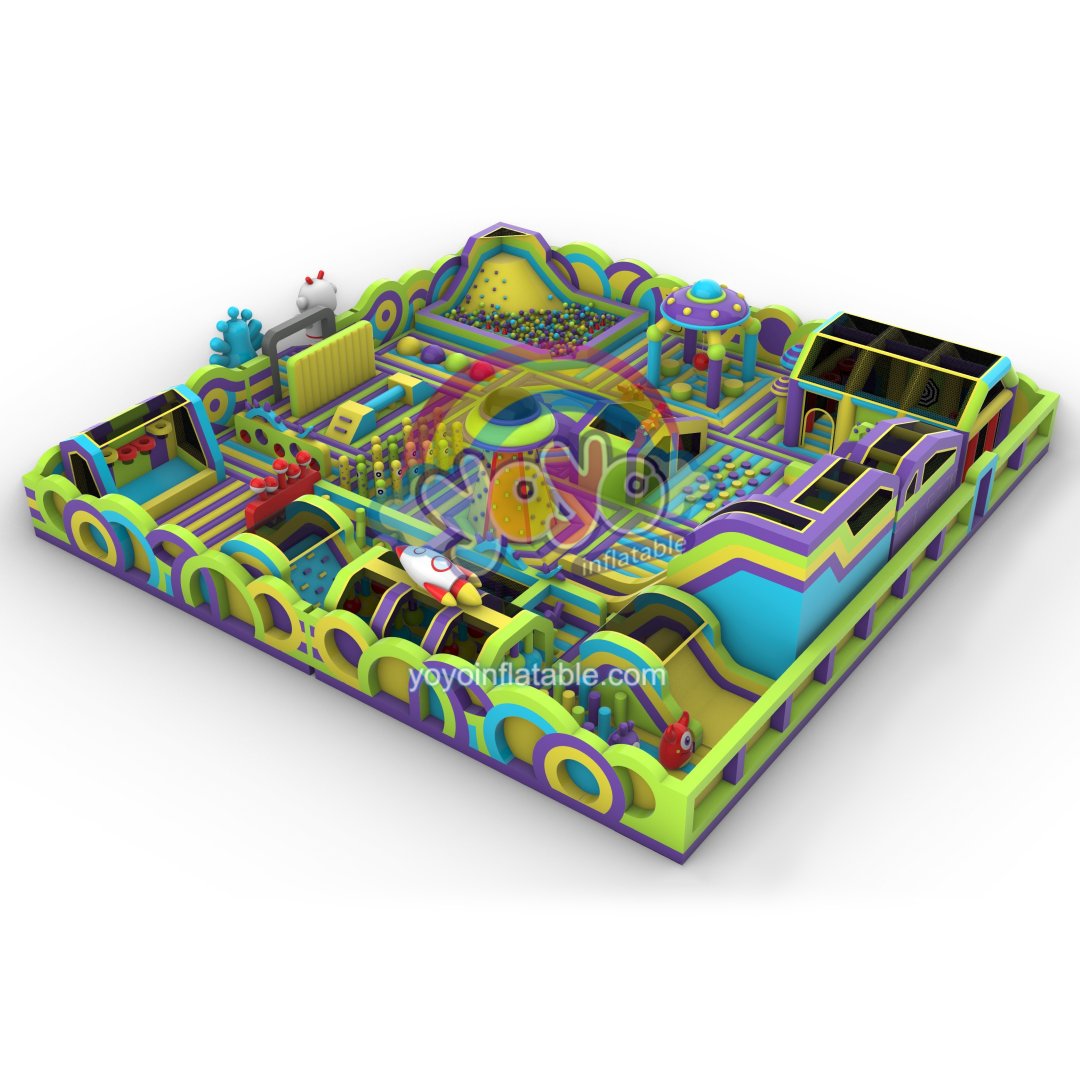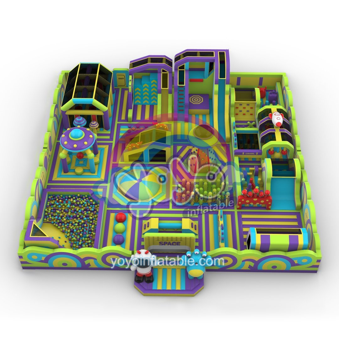 Engineered to captivate, our monster space big inflatable theme park spans nearly 30 meters with a vibrant galaxy of yellow, blue, green and purple. Kids will love exploring its cosmic world featuring friendly monsters and astronauts. The park includes a bounce platform for jumping, a climbing tower for strength-building, a mini obstacle course, basketball hoops and interactive games with bubble and hanging balls.