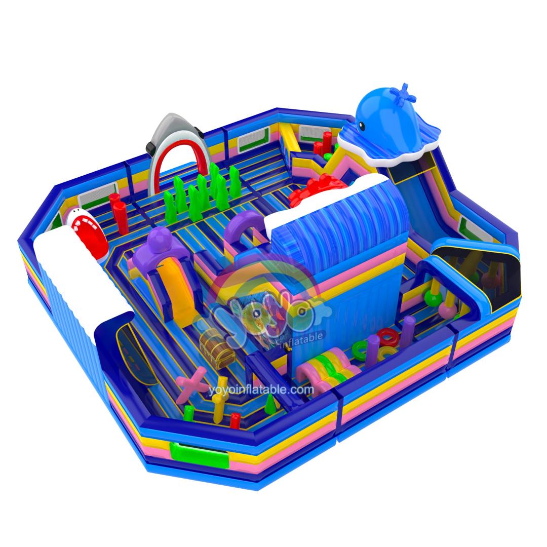 Go on endless aquatic adventures with our ocean world inflatable theme park. This sprawling park features three securely interconnected zones, linked with double-layer sandwich-style velcros for ultimate stability. Navigate through an exciting obstacle course, scale vibrant climbing walls and enjoy dual racing slides under a wave-like canopy.