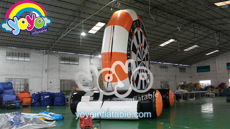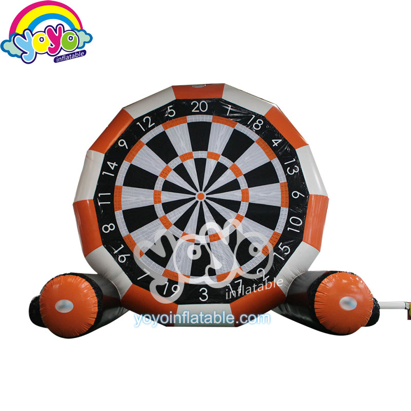 This giant inflatable football darts game is a classic design. The main colors are orange, black and white. The entire structure has two big inflatable tubes are the base, the huge velcro target sheet is a classic bar dart board design. However, the darts are inflatable velcro footballs. You can kick this velcro football onto the giant dart board for fun. Double sides design allow more players to have fun at the same time. Perfect inflatable games for birthday parties and interactive events like wedding, commercial activities and so on. Come to yoyo inflatables to customise more inflatable dart boards.