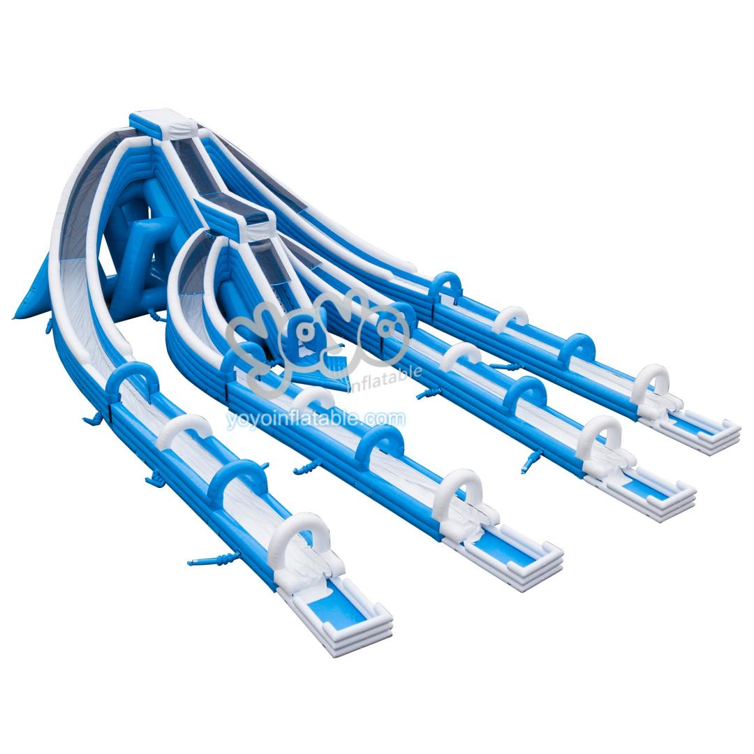 This outdoor huge hippo 4 lanes inflatable water slide sports a clean light blue and white palette, stretching 36 meters in full length. It features a central entrance formed by a rhombus base and two small arches, paired with dual climbing blocks fitted with sturdy reinforced handles. Full-length black handwebbing lines both side walls to boost climbing stability and safety for every user.