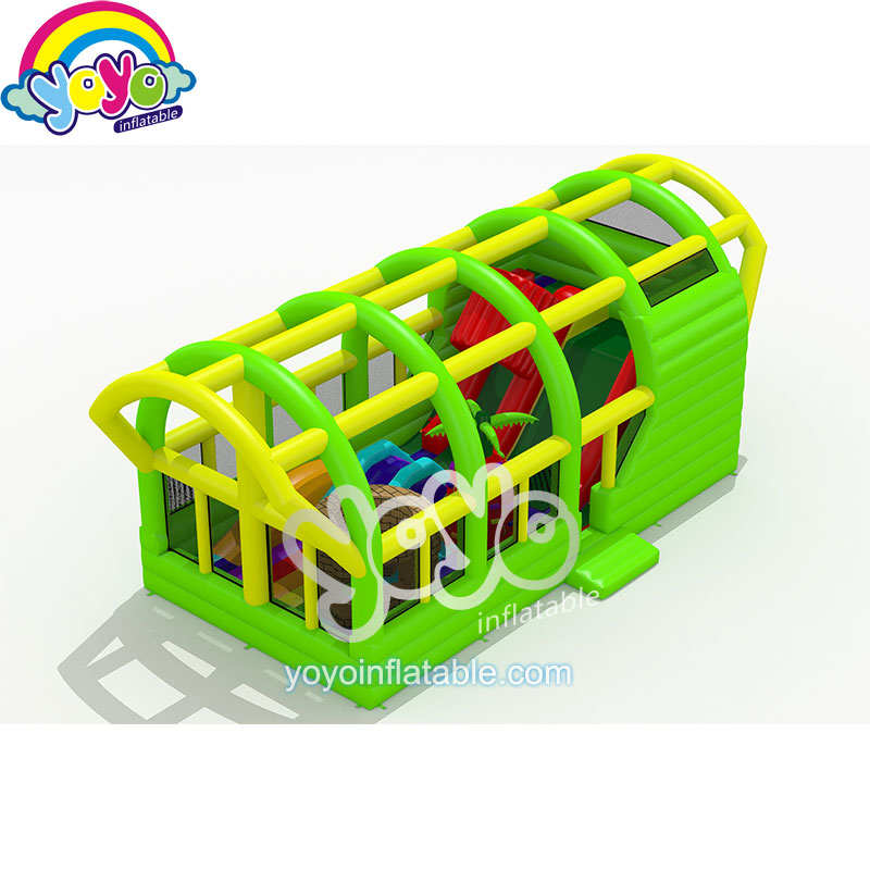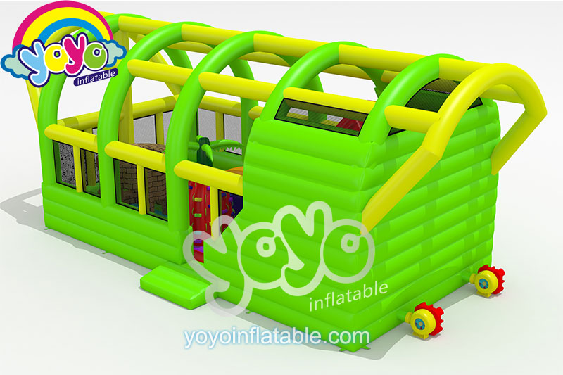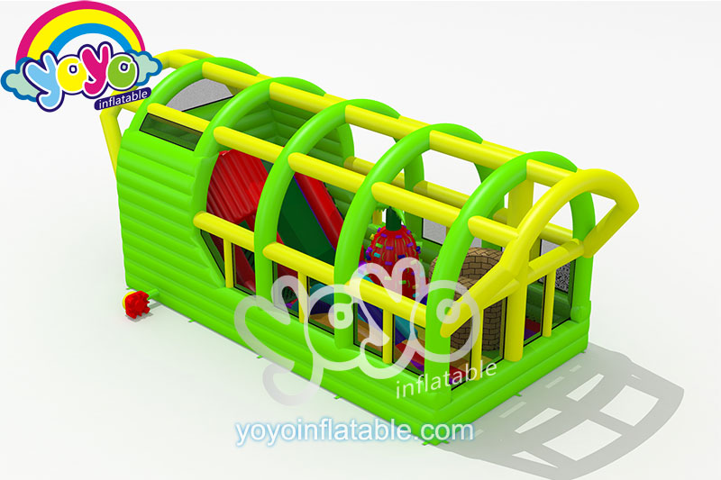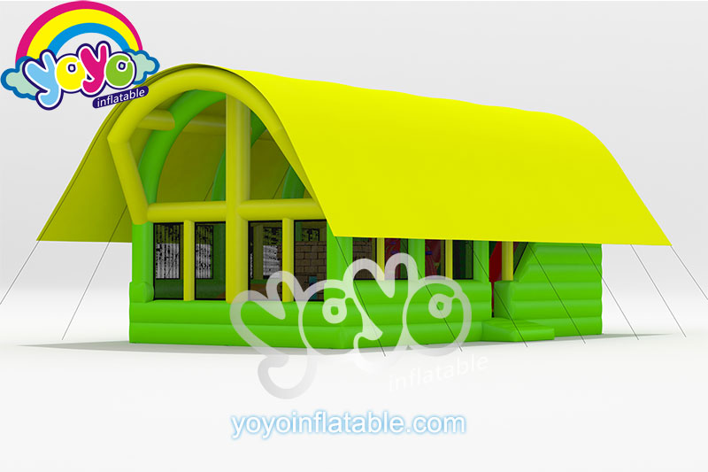 If you are looking for a giant inflatable amusement park that can be set up outdoors for days, this design will be your best choice. Because it’s totally a big inflatable warehouse structure, with a waterproof tarpaulin roof to shade and keep out the rain. Inside this inflatable playground, an inflatable bunker and small slide at the front park, a pineapple style climbing wall in the middle, and a giant slide in the back. Kids will have a great time with no doubt! It’s perfect for removable carnivals and outdoor wedding parties. Contact yoyo for a unique solution!