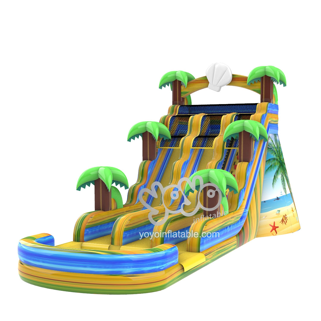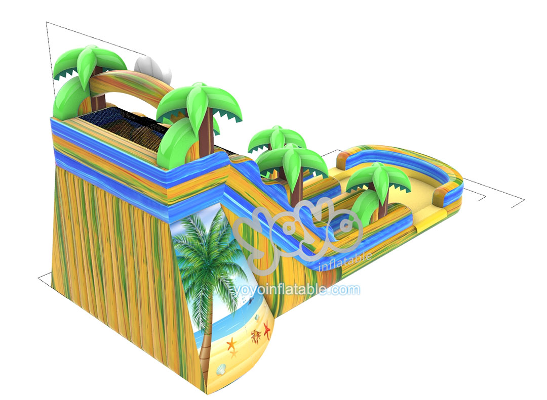 This total 22 feet tall huge inflatable water slide is designed with the Palm Tree and Beach theme, which is super popular in hot summer. This palm tree beach theme is designed to bring coolness to people, which is in line with the function of this giant inflatable water slide. The slide comes with two sliding lanes and one climbing stair, six cartoon palm trees and one small inflatable water pool at the bottom. Made of high end Marble colors PVC fabric, and full printing of beach scenes on both sides.