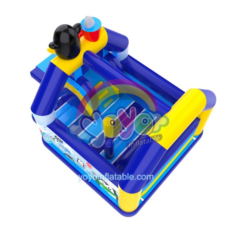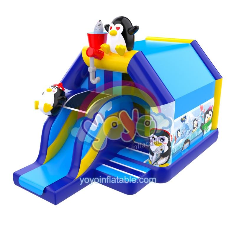 Introducing our penguin shop inflatable bounce house slide combo, the ultimate playtime solution for little ones! This delightful penguin-themed inflatable combo combines the thrill of a bounce house with the excitement of a slide, all wrapped up in an adorable design. Crafted from durable colored PVC, this slide combo is built to withstand endless fun. The slide is topped with a safety net for added reassurance, while penguin cartoon decorations and themed spray paintings bring the magic to life. Obstacle posts and other elements add an extra layer of challenge and fun.