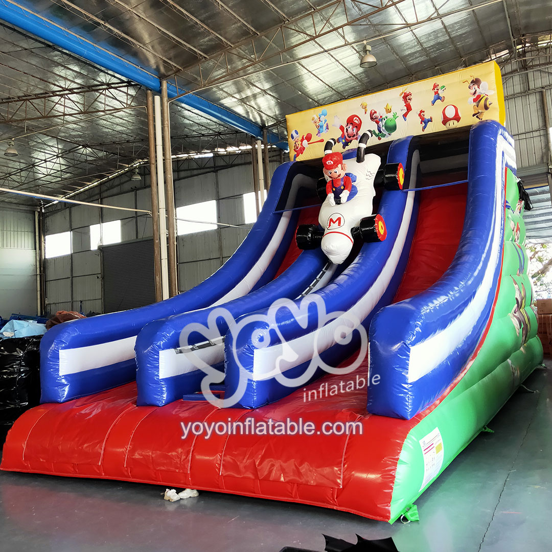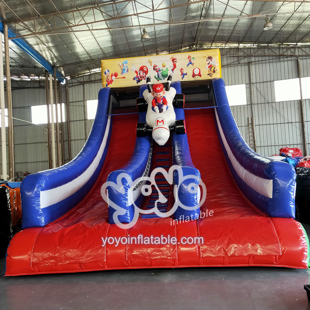 Inflatable slides can provide both kids and adults with a fast and exciting sliding experience. The Super Mario Kart Contest video game theme inflatable slide attracts children’s attention with its rich colors and cute cartoons. They are usually designed with images of animals, cartoon characters, trucks, etc., which increase children’s interest and intimacy. One climbing lane in the middle with an attractive Mario cartoon on the top, and two sliding lanes on the both sides.